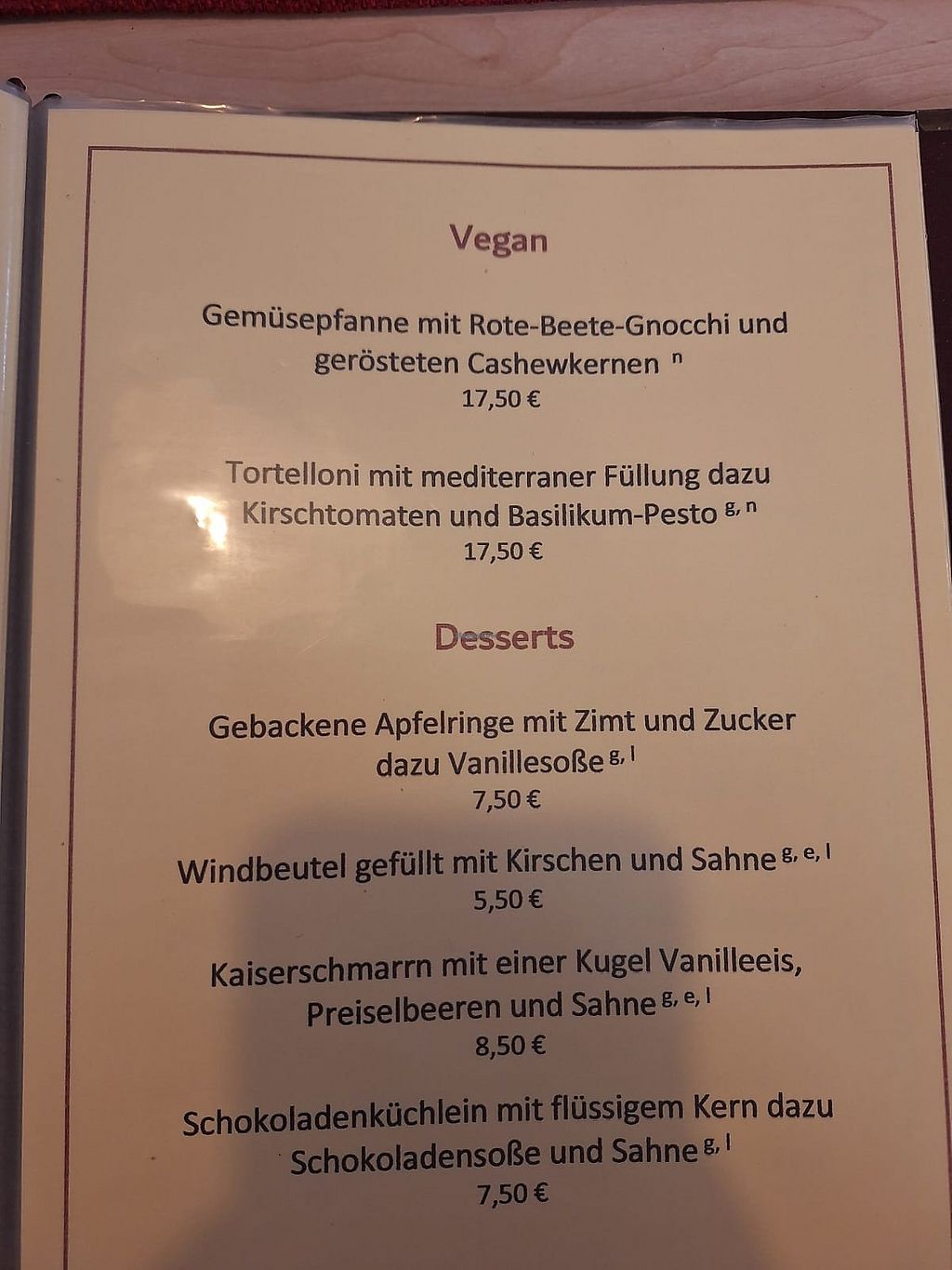 Serves meat, vegan options available. German restaurant serving mostly regional dishes. Has a vegetable wok with beetroot gnocchi and also filled tortelloni. Limited options nearby. Open Wed-Sun 12:00-21:00. Closed Mon & Tue.