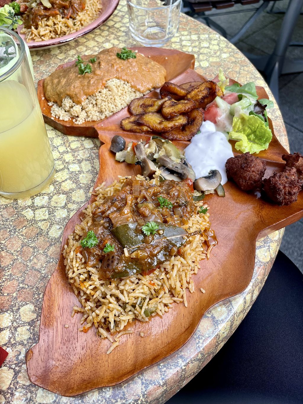 i had the vegan afro platter with jollof, cousous and peanut sauce along with deep fried plantains and bean mousse balls and all of it was just spectacular