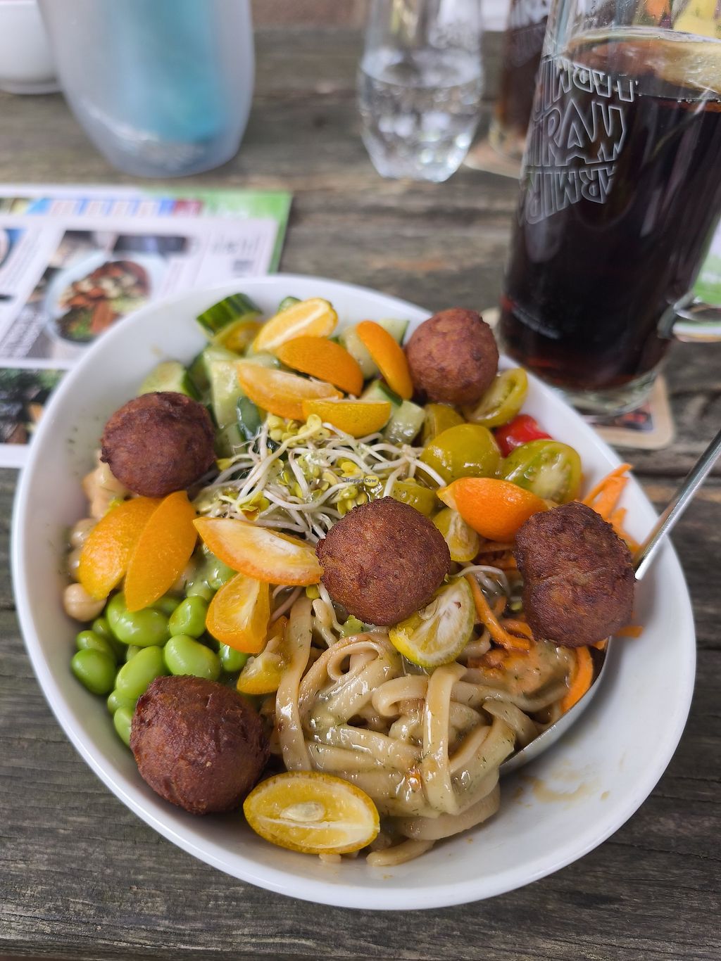 Green Bowl, Jackie Burger, Knoblauchbrot, Kichererbseneintopf