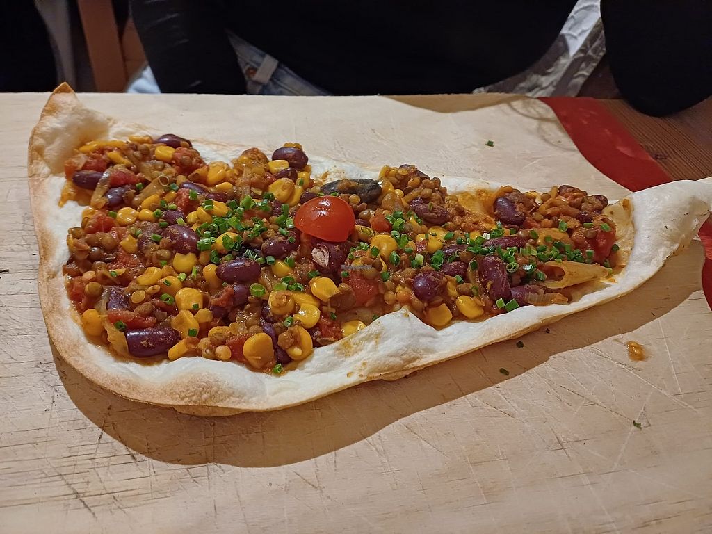 Typical austrian restaurant (unfortunately) with just one vegan option: a vegan Flammkuchen with corn, beans and tomatoes. Was great! Had a delicious mixed salad as well. Just ask for a vinegar-oil-dressing.