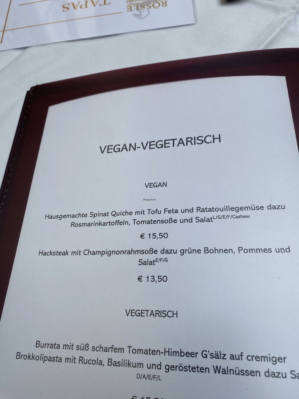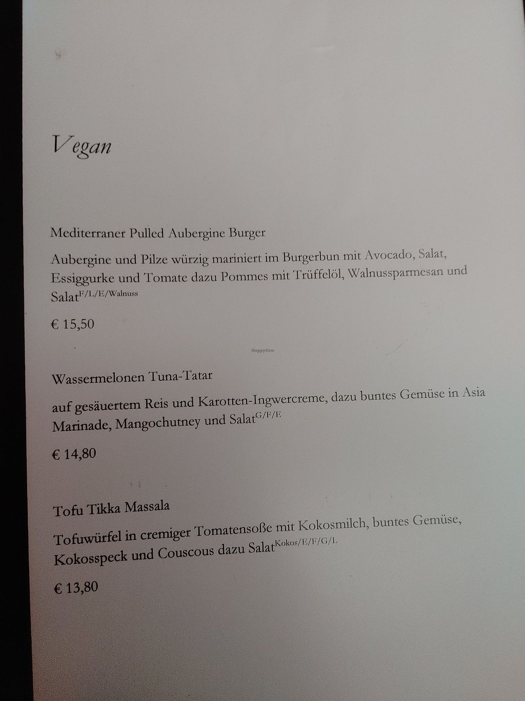Von Suppe über Salat und Hauptspeise bis zum Nachtisch werden auch vegane und vegetarische Gerichte angeboten. Die vegetarischen lassen sich teilweise auf vegan upgraden. Besonders hervorzuheben ist, dass es sich nicht nur um einfallslose Alibigerichte handelt, sondern um ausgesprochen leckere Kreationen!! Unbedingt wieder einmal!