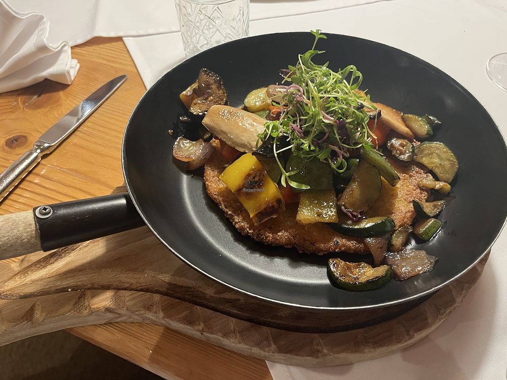 Serves meat, vegan options available. Hotel restaurant serving Austrian food with a few labeled vegan options, such as bruschetta, roasted vegetables with baked potato, kale-potato rigotte, and rösti that can be made vegan by omitting egg and sour cream. Vegan labels are included in the dish descriptions but may be hard to recognize at a glance. Open Mon-Sun 11:30-11:00.