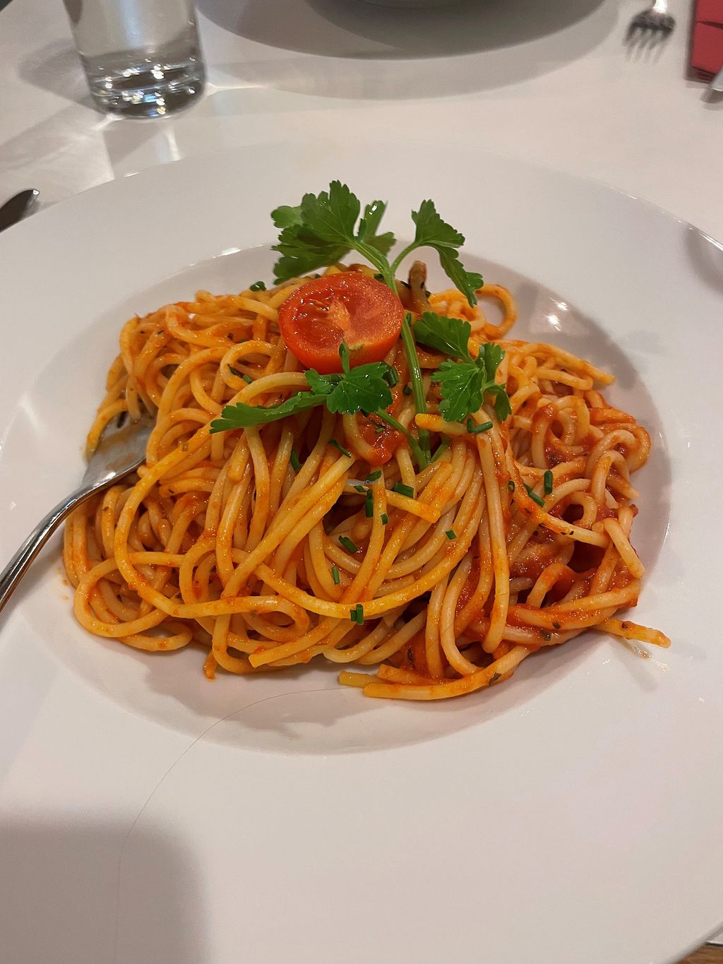 The restaurant has 2 soups and 2 pasta dishes to choose from, which are marked vegan. I had the Spaghetti Napoli with a salat. The salad dressing is automatically vegan. It was very tasty and enough for the price.