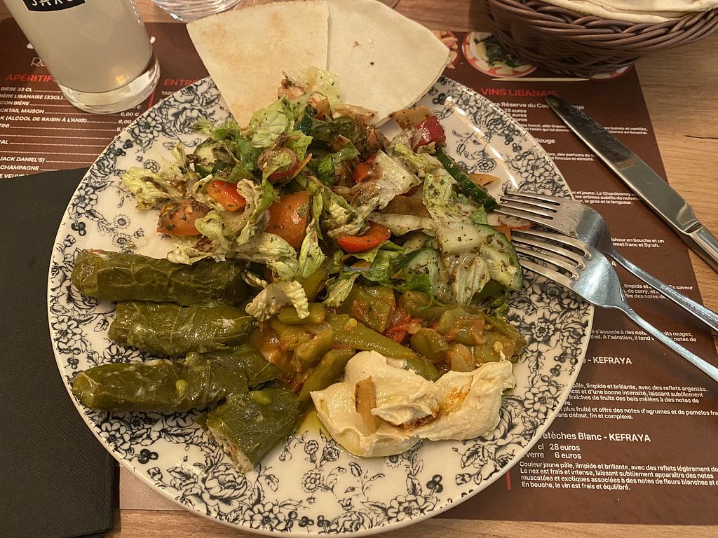 Très bon plat végan composé des dolmas (feuilles de vigne farcies au riz), des haricots verts, de la salade, de la sauce houmous et des bons pains libanais. Surpris du goût des falafels, c'est bien aéré et on sent bien de la coriandre. Sans oublier l'eau plate à fleur d'oranger qui parfume bien à la bouche.