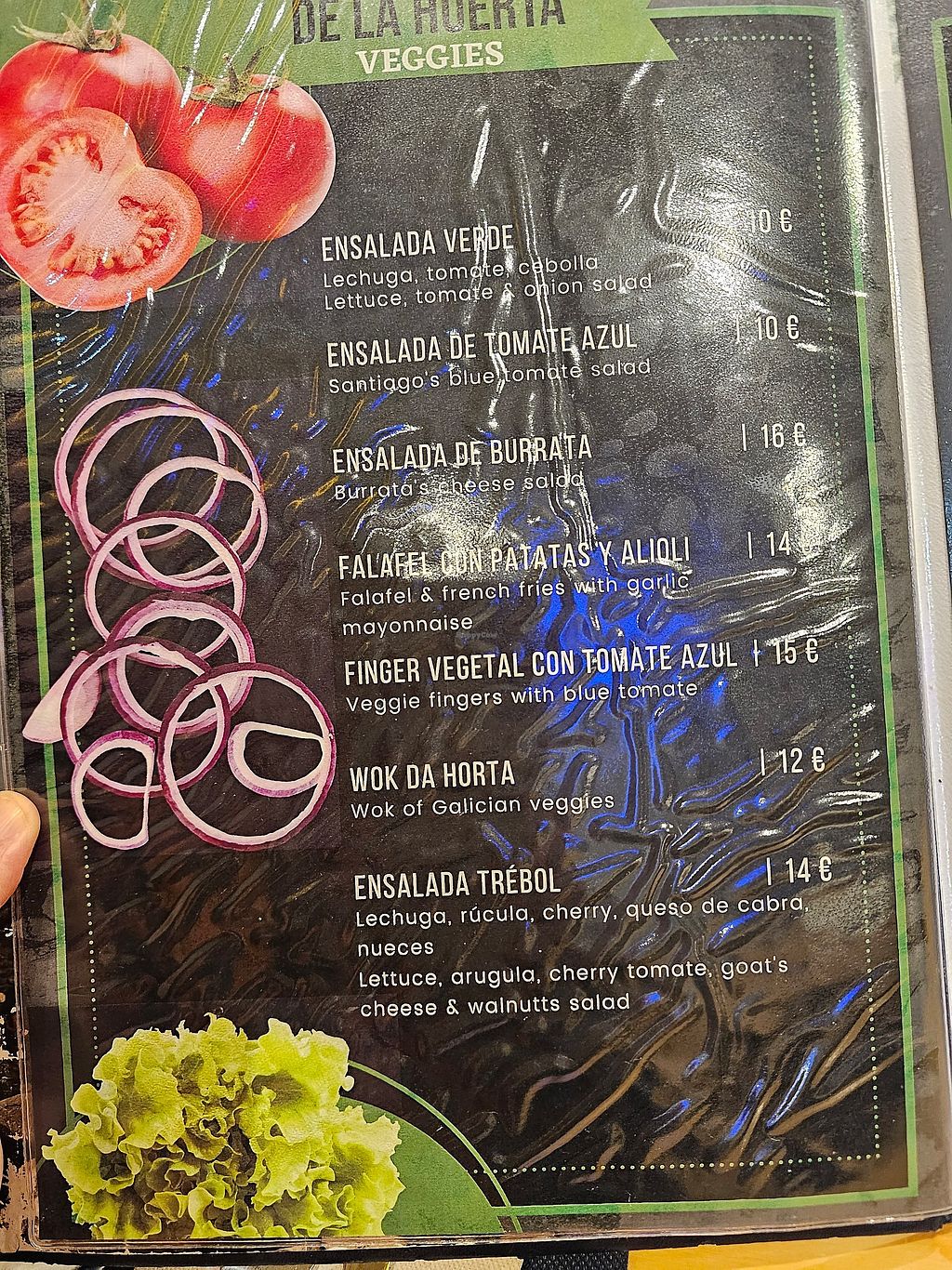 Nice famiy-run restaurant right in the middle of Santiago, 50m from the cathedral, with a dedicated veggie section on the menu in both Spanish and English, which includes several salads, falafel with chips, veggie fingers with blue tomato salad, and veggie wok. Very friendly staff.