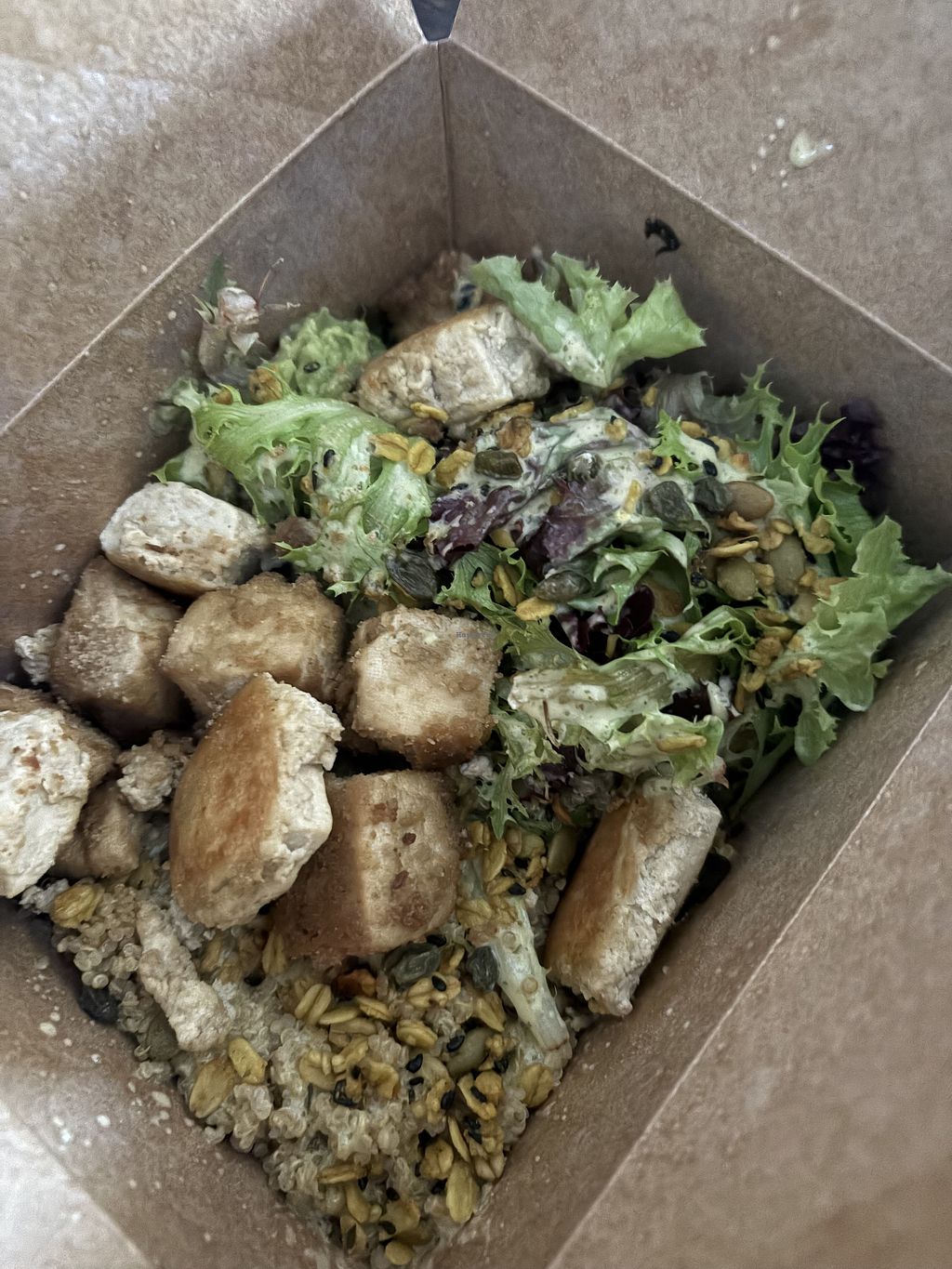 We loved the Caesar salad and huevos rancheros tofu scramble. Blueberry bar was tasty too!