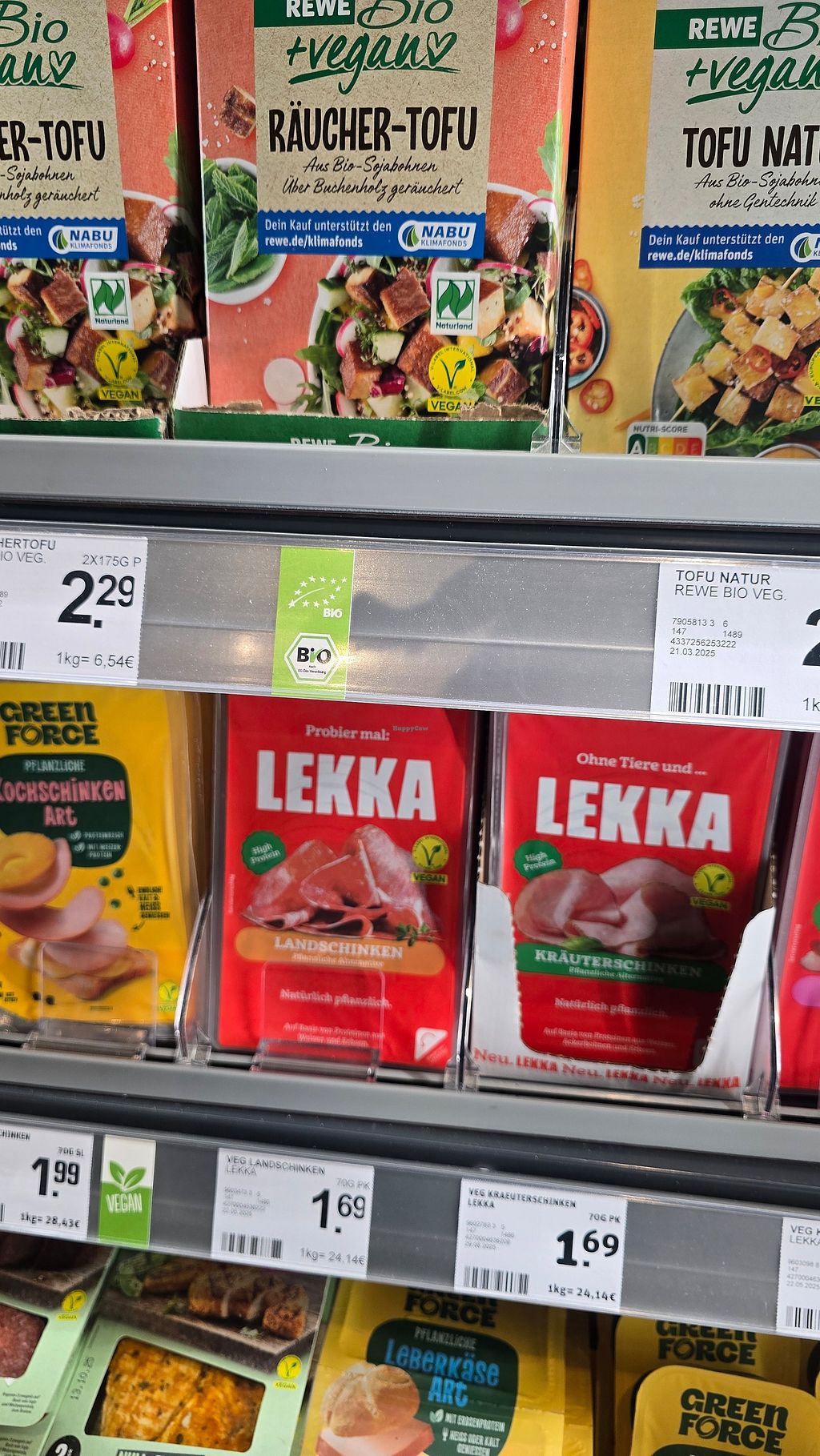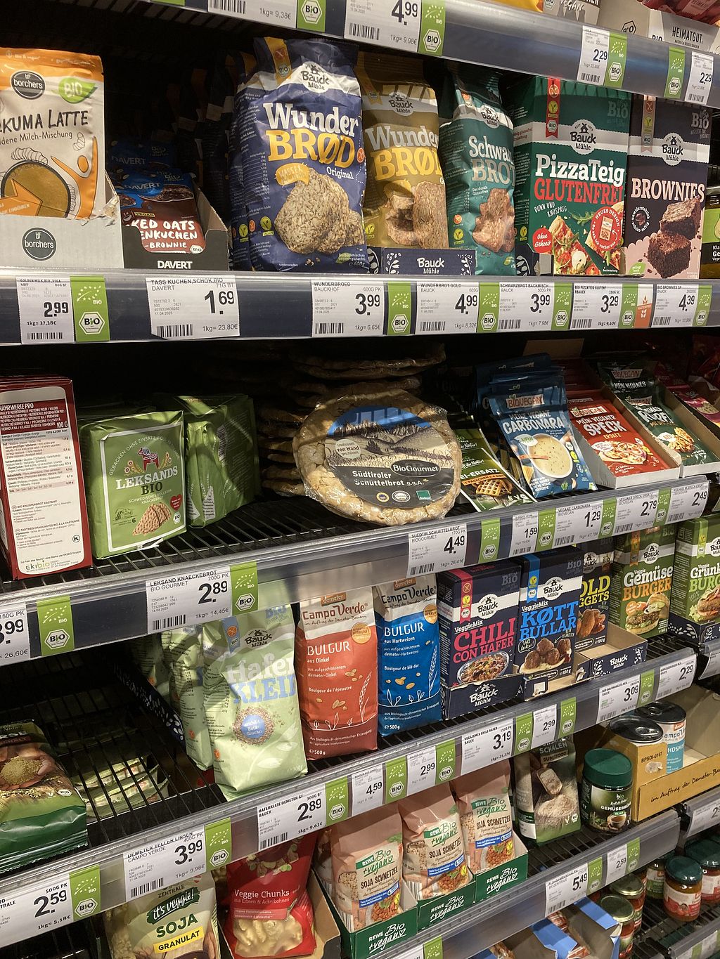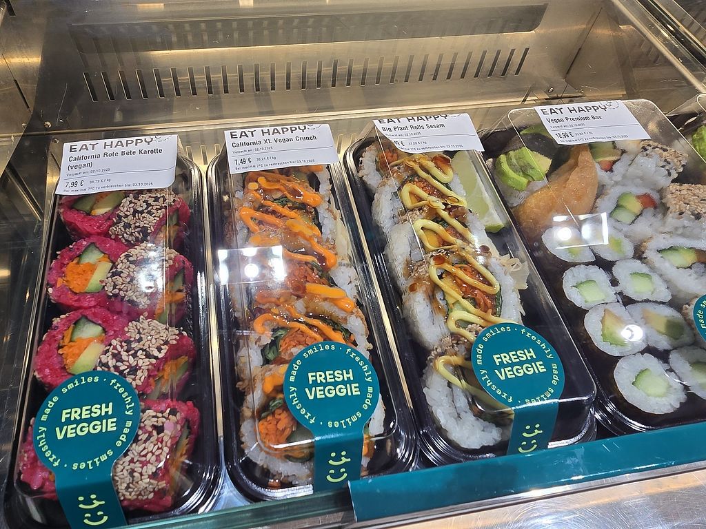 Grocery chain from Germany. Product range include various vegan products. The prepared foods stand by the entrance has vegan foods for takeaway like veggie sushi, gyoza, and sandwiches. Open Mon-Fri 08:00-20:00, Sat 08:00-19:00, Sun 08:00-18:00.