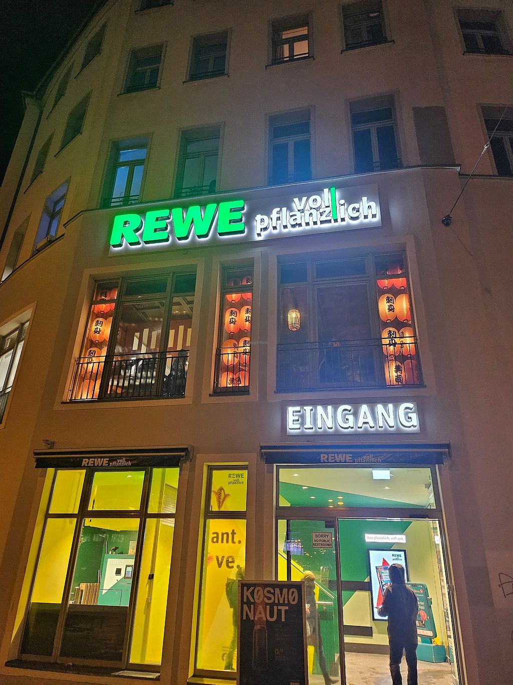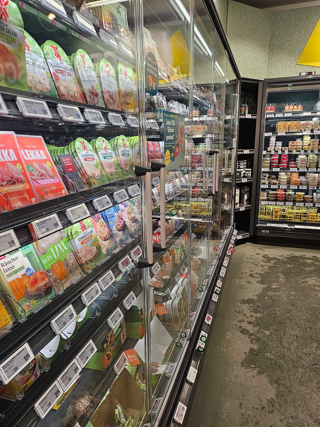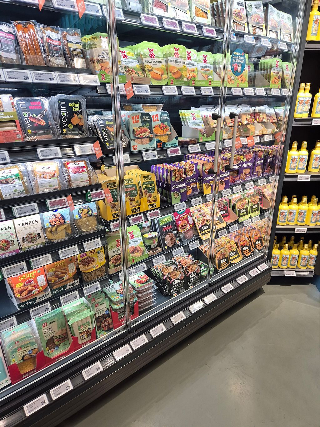 Dieser Rewe hat nur vegane Produkte. Man spürt wie beliebt der Rewe ist weil immer Kunden da sind. Da sieht man selbst wenn Fleisch verboten wäre, Supermärkte funktionieren trotzdem.