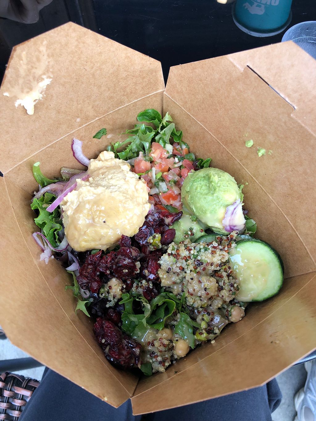 There are a few options for vegans here: the Green Wave bowl, a vegetable hummus wrap, and a vegan jelly donut. The Green Wave bowl came with greens, quinoa, chickpeas, pickled red onions, cranberries, pico de gallo, and very generous scoops of guac and hummus. It was filling, nourishing, and vegetable-forward - just what I was looking for.