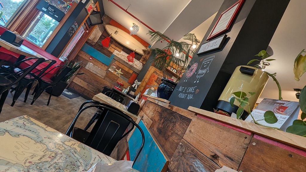 Plenty of vegan friendly food options and plant milks to choose from. I grabbed the veggie wrap (huge!), vegan jelly donut, and an oat milk latte. Definitely worth the stop while in Tofino.