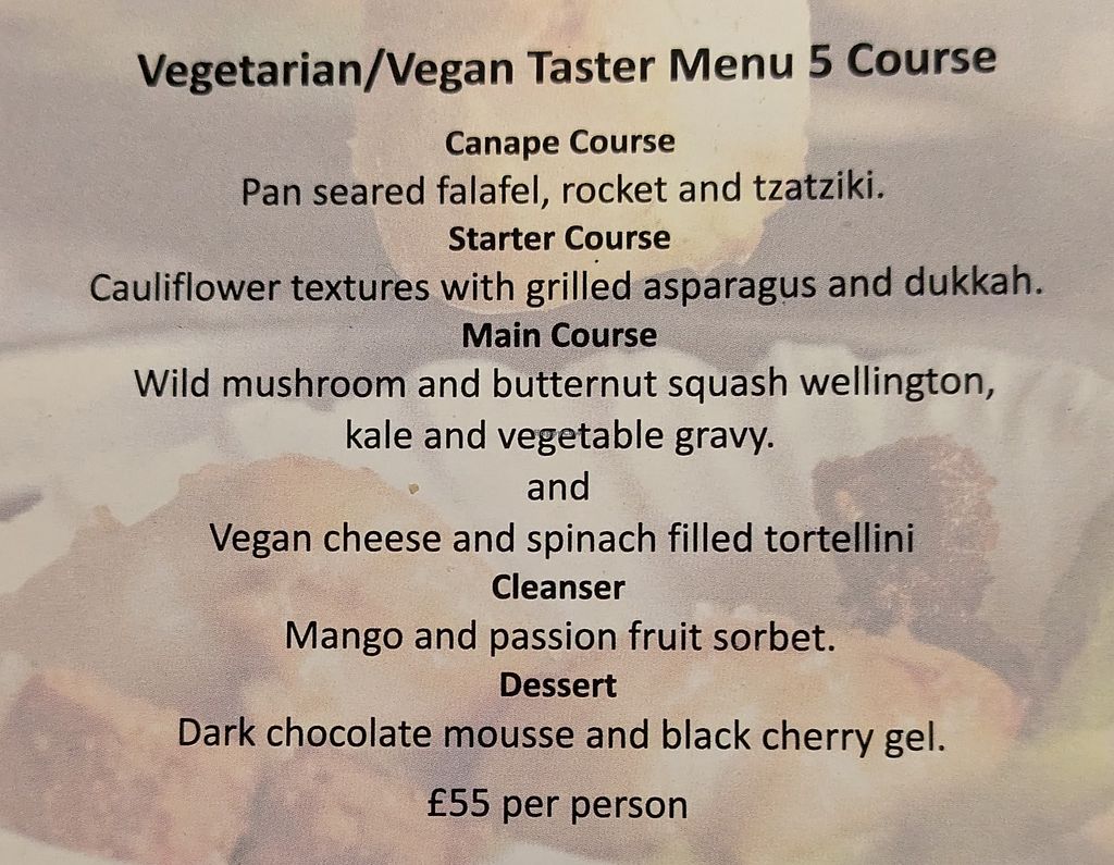 Visited to try the vegan tasting menu at Rhubarb and it was fantastic. We had a lovely table for two and ordered a bottle of wine after Googling, it would be nice if they labelled which wines were vegan as there were quite a few on the wine list. The food was fantastic, beautifully presented, perfect size portions, although we were full by the end, the dishes were well thought out and executed and full of flavour.