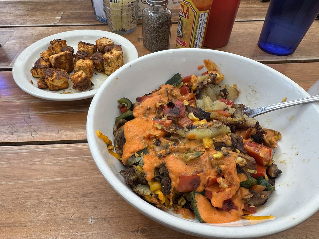 Early Bird Breakfast with tofu, breakfast potatoes, and homemade Engli…
