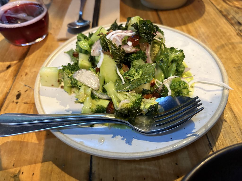 The smoked broccoli salad also amazing, with the fresh tasting coconut-pea puree, black vinegar, and perfectly cooked broccoli on the right side of al dente.