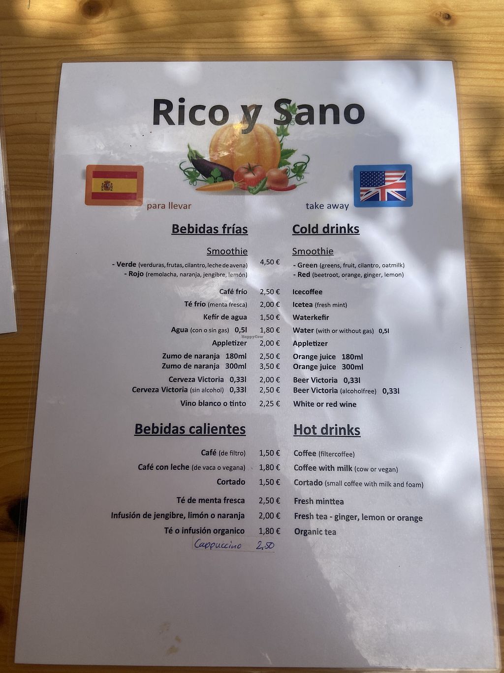 What a delight this little restaurant is. Tucked away in a quiet corner of Vueltas, with beautiful views of Vueltas playa, and lovely, helpful staff. They do wraps, sandwiches, salads, mains such as vegan lasagne, but best of all delicious soups. We went there four times in the five days we spent in Valle Gran Rey and I struggle to decide which was my favourite soup: broccoli? Traditional gazpacho? Subtly spiced daal? Beer is Victoria, which makes a nice change form the ubiquitous Dorada.