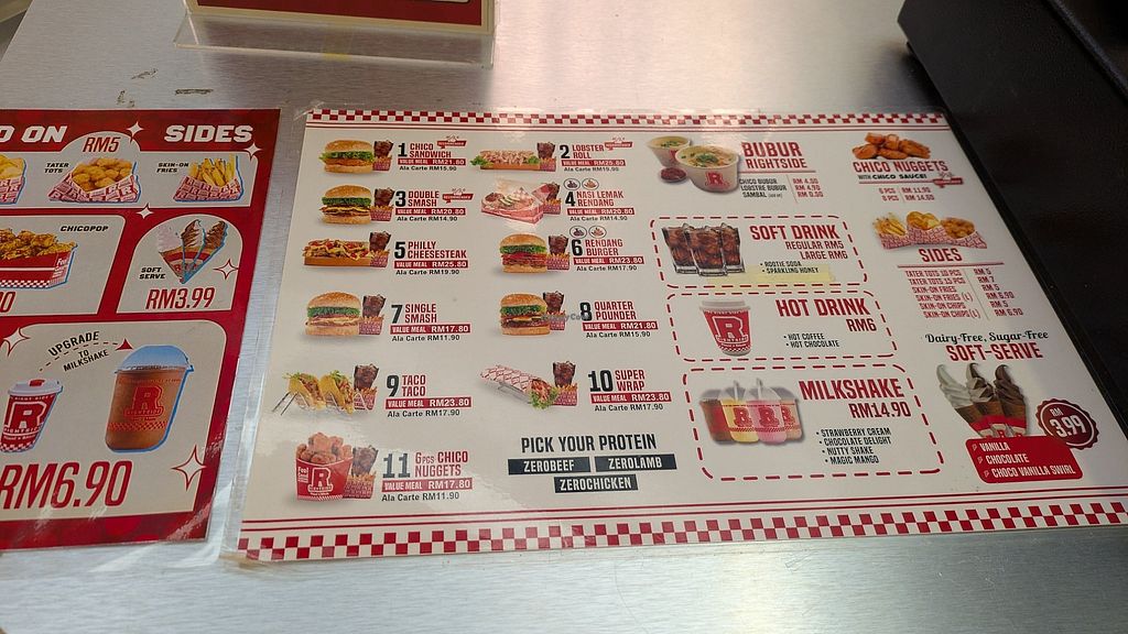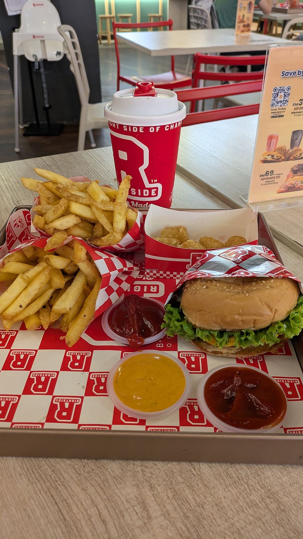 This place is on the third floor of the Mid Valley Mall, which connects to the Gardens Mall which in turn connects to the Abdullah Hukum LRT train station. There is plenty of seating dedicated for Rightside customers only, so although I appreciated having no problems finding a place to sit, having seating dedicated to Rightside customers made me feel segregated. The food is all vegan junk food or fast food. Regardless of how healthy the food is, it was mostly very tasty. The soda was sweet and the sauces in the wraps were creamy. The food is also not photogenic often with sauces dripping and smearing everywhere. When you order you are given a number and when your order is completed a machine reads out your number and you pick up your food, and afterwards there is an area you store your tray.