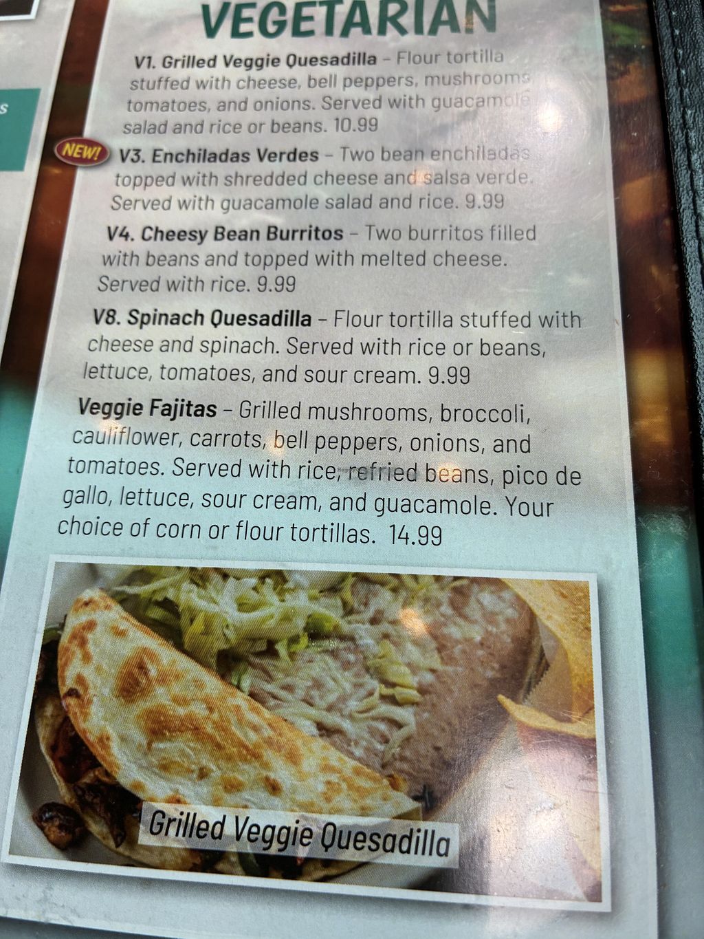 Serves meat, vegan options available. Offers vegetarian dishes that can be made vegan by request, such as black bean burrito without cheese, veggie fajitas without sour cream or refried beans, and enchiladas verdes without cheese or guacamole salad. Open Mon 10:30am-9:00pm, Tue-Sun 10:30am-10:00pm.