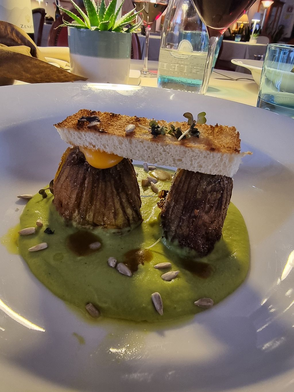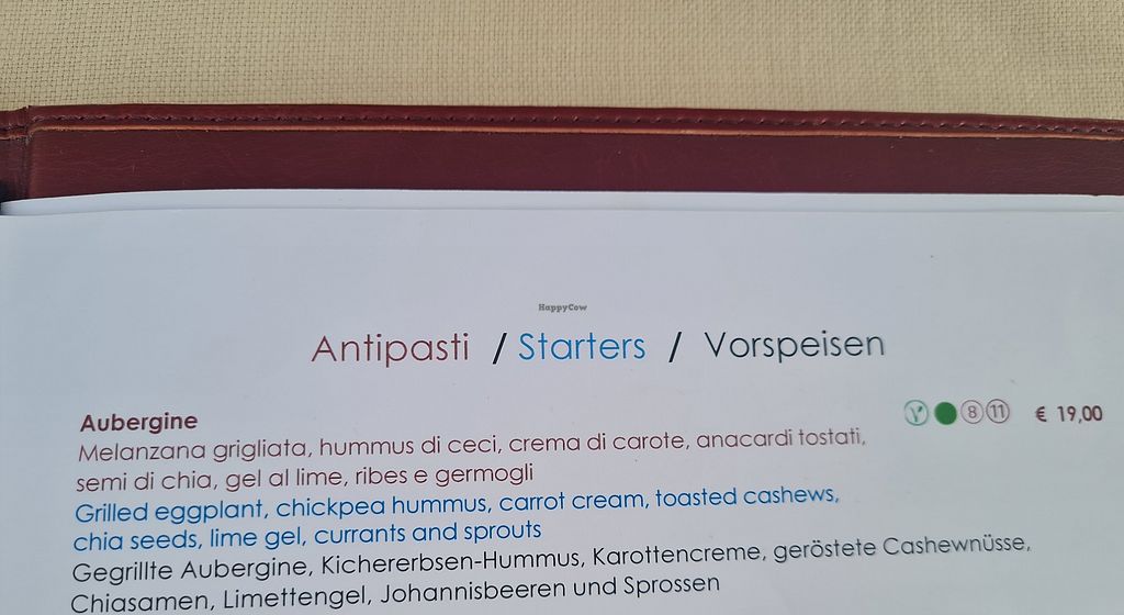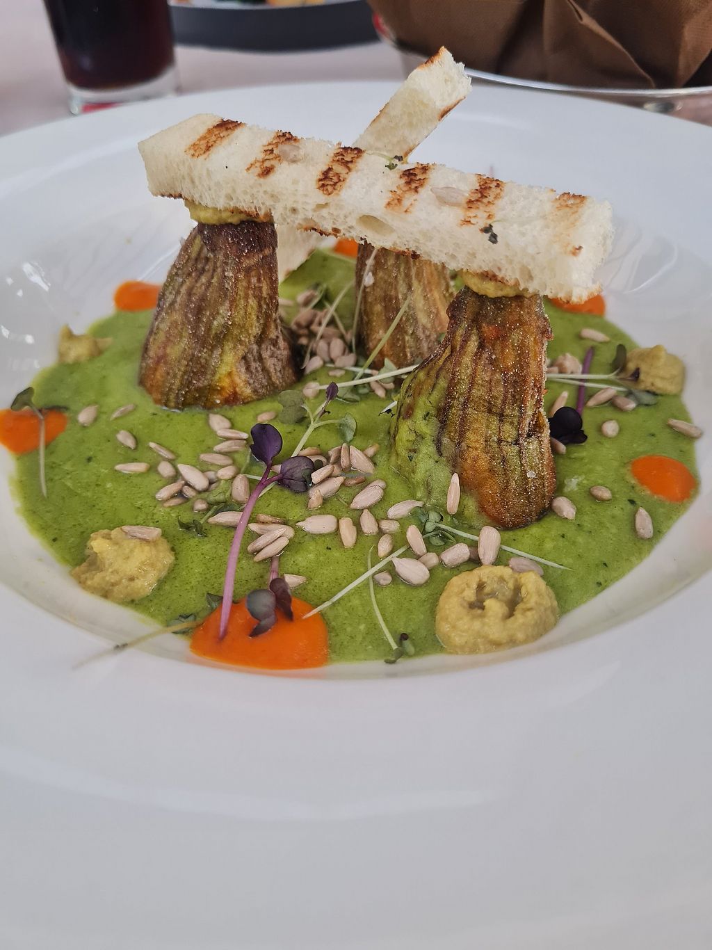 Grilled aubergine, chickpea hummus, carrot cream, toasted cashews, …