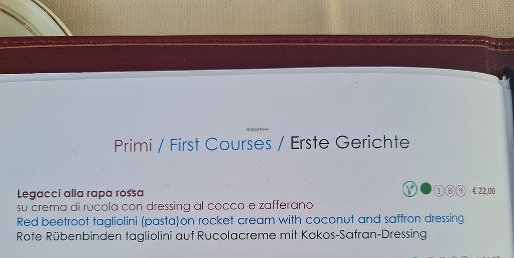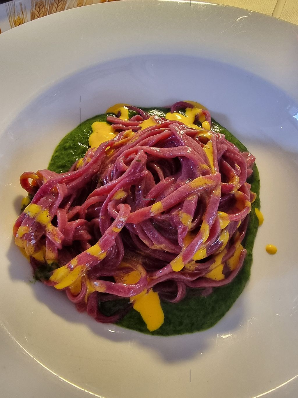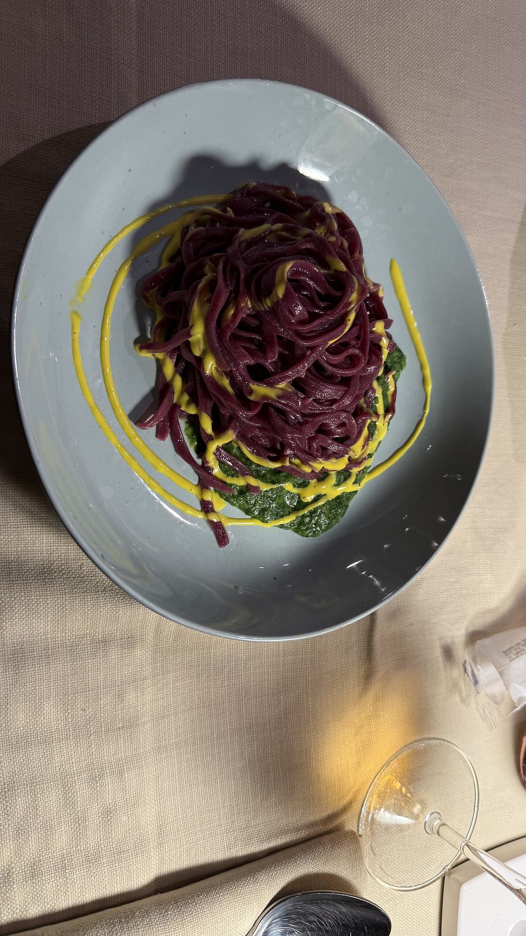 Legacci with red turnip on arugula cream with coconut and saffron dres…