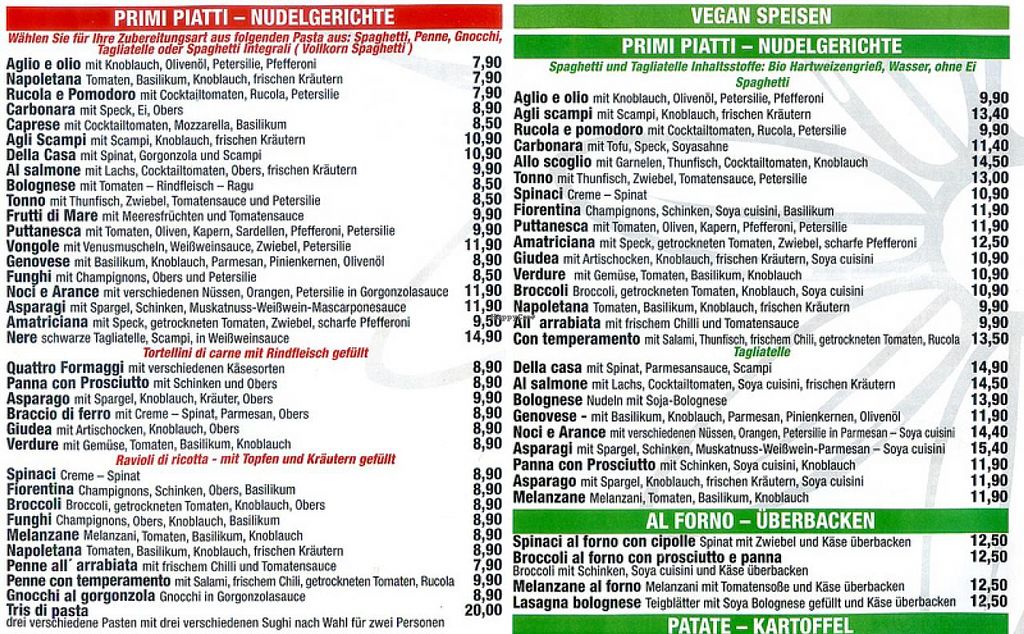 Huge menu providing vegan meals, many of whom contain meat substitutes. Typical Italian dishes, various pasta options, at least about 20 different pizzas, vegan bacon, vegan pork, vegan shrimps, nothing is impossible.