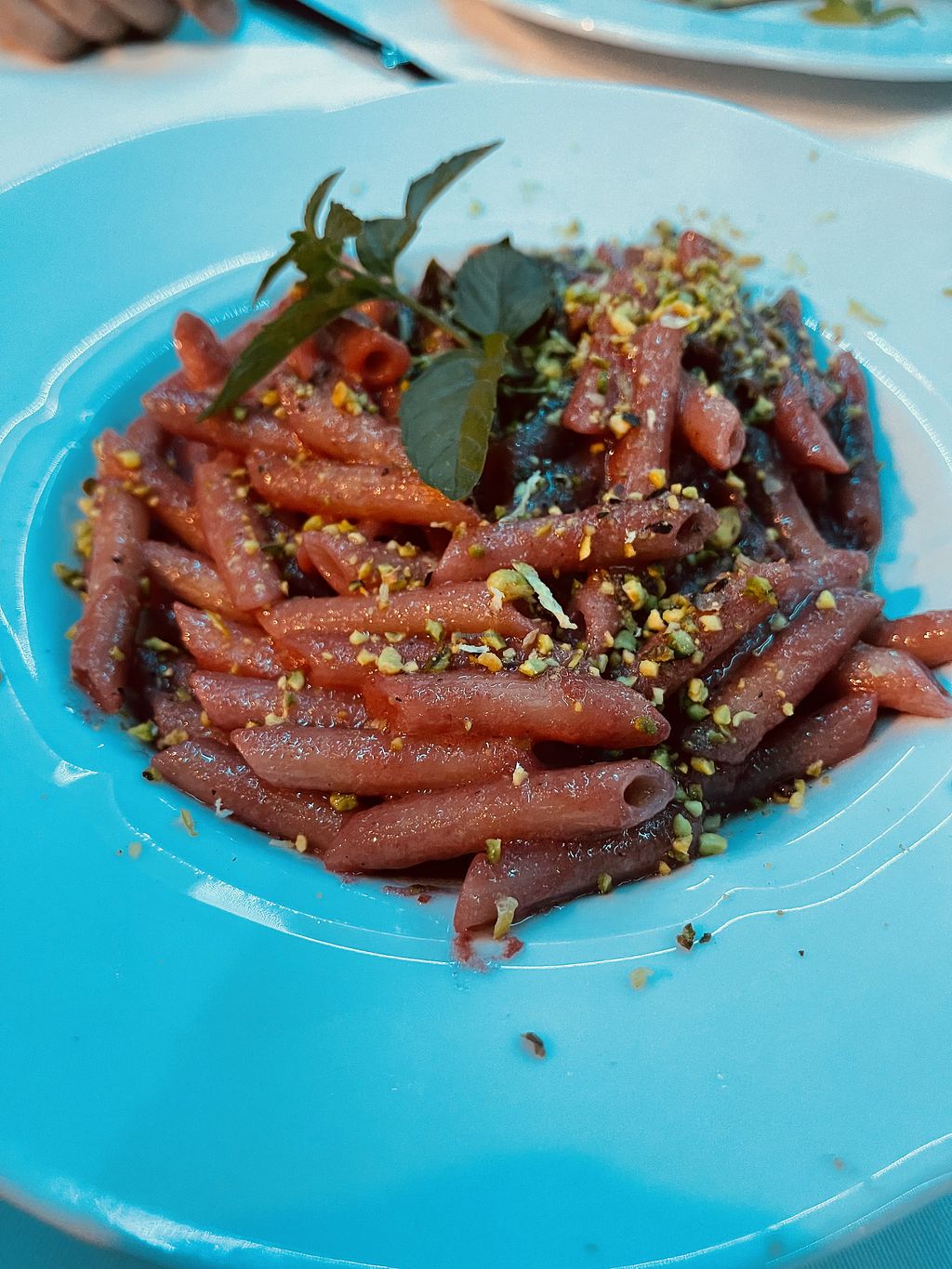 Mezze penne con barbabietola lime e granella di pistacchio
