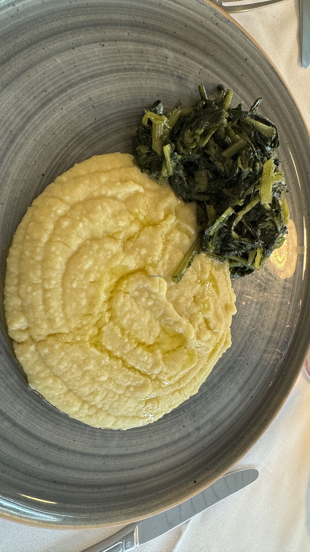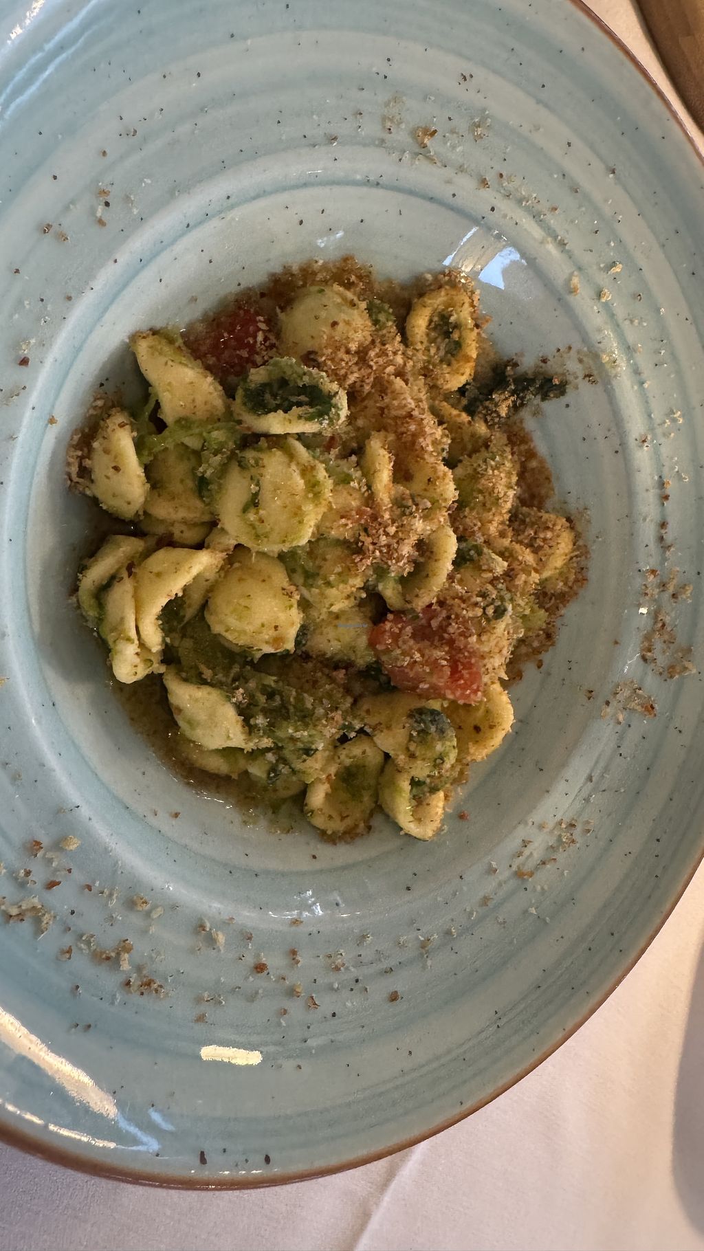 The first course was about €20 and was pasta and tomatoes served on apuree of broad beans and the side of wild chicory was €9.