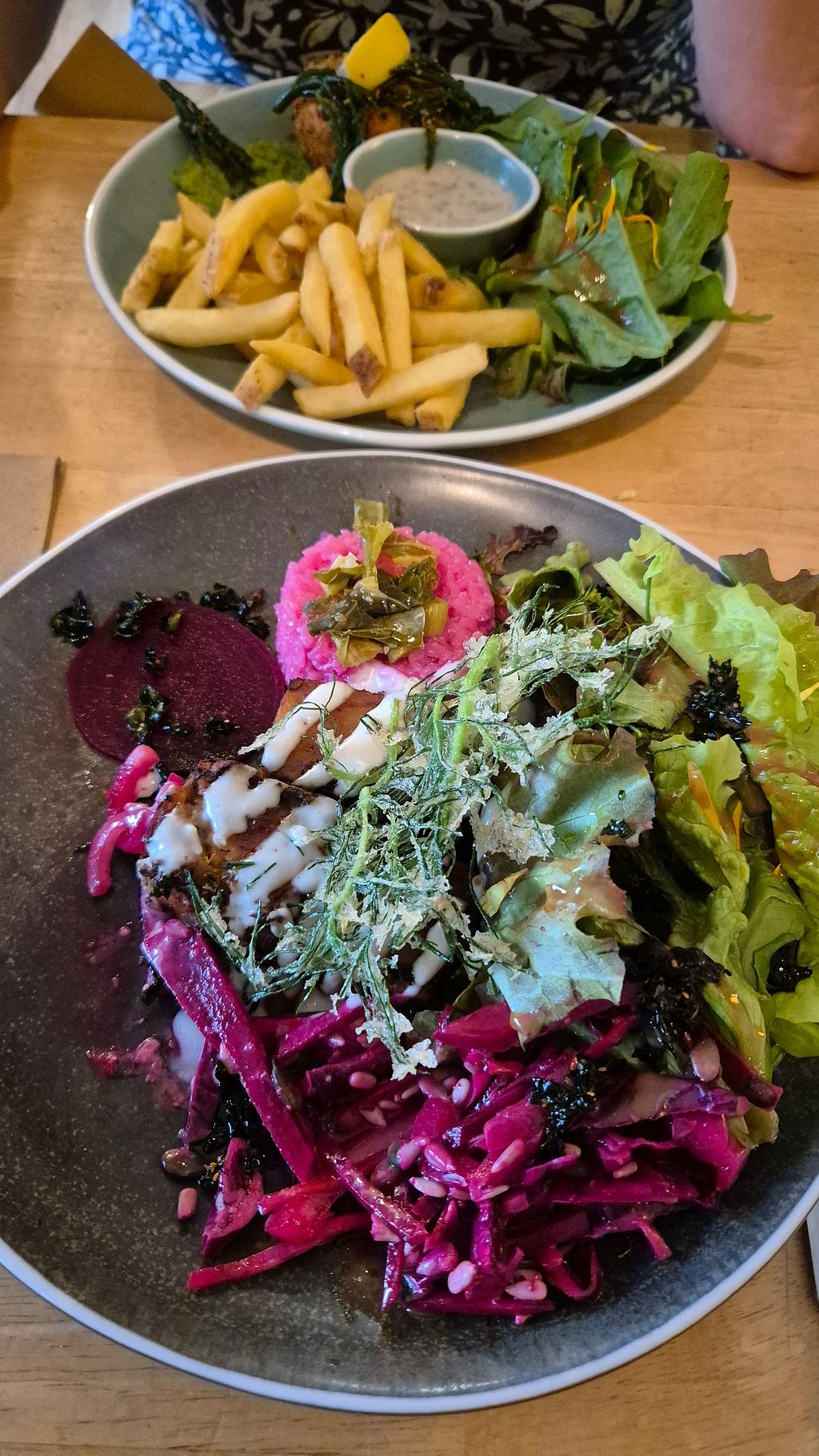 This restaurant is light and airy, serves different dishes to suit different plates, we visited on a Sunday and there were classics like a "sea" pie and roast on the menu. The starters were delicious if a little on the oily side. We had a "sea" pie which had samphire, tofu and sweet potato in a creamy sauce topped with potato mash and it was a very creative version of the classic fish pie (which to be fair I have never tried in my life). We also had a plate called "okonomiyaki" which was not what I expected at all because it really didn't look like an okonomiyaki, but nevertheless it was very good, with flavour and lots of textures. The desserts were good too, we had a chocolate sundae which was massive and very filling and a raspberry dessert a bit like a fool, very refreshing.
