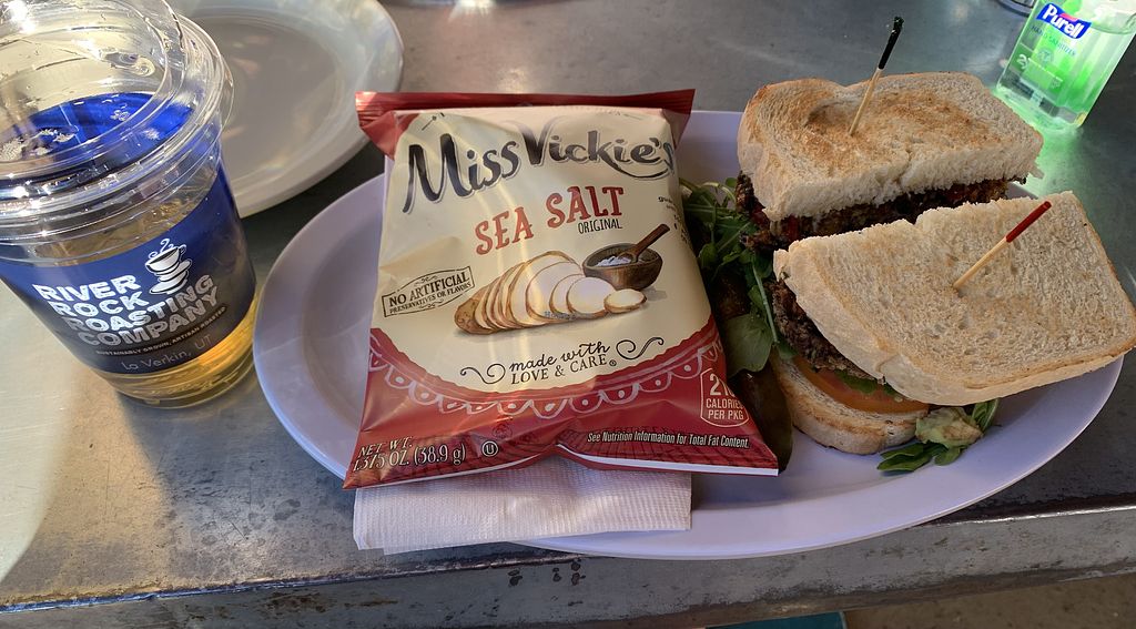 Vegan black bean burger, served with pickle spear and chips(which I ac…