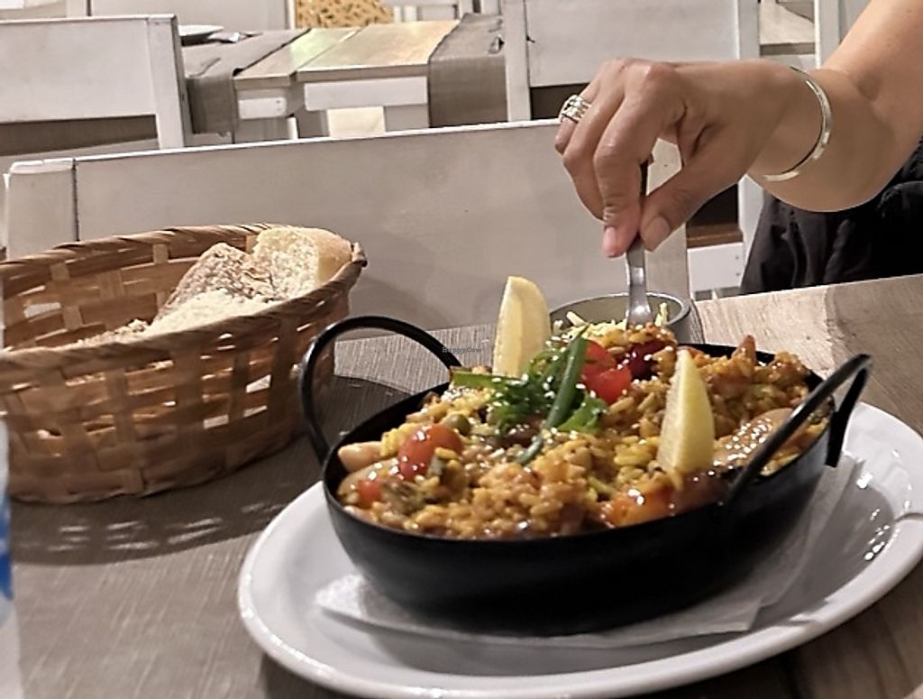 Serves meat, vegan options available. Restaurant offering a vegetarian section with items that are or can be made vegan such as vegetable or tofu wok, paella and bread with hummus. Open Mon-Sun 8:00am-12:00am.