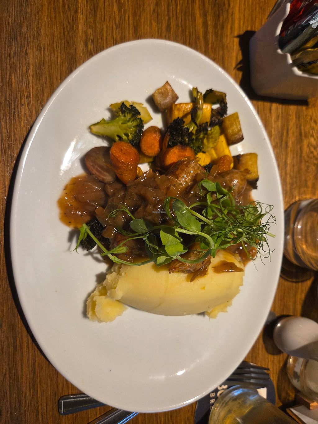 Saucisses purée, sauce gravy et légumes rôtis