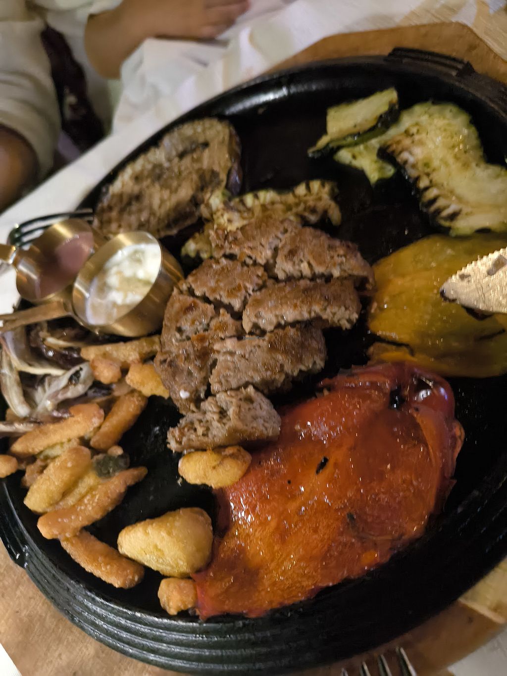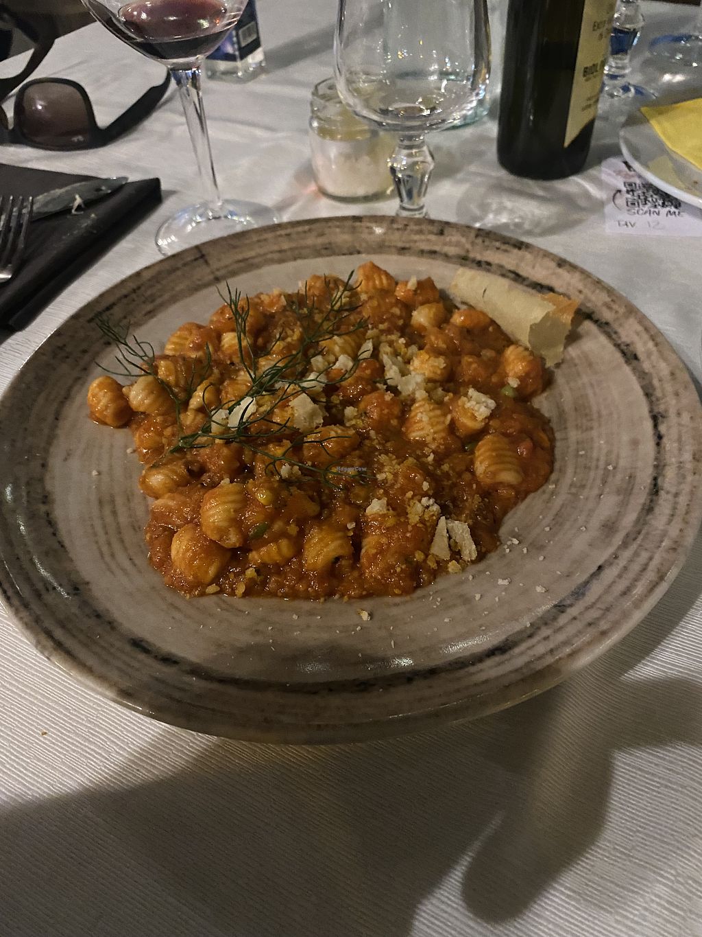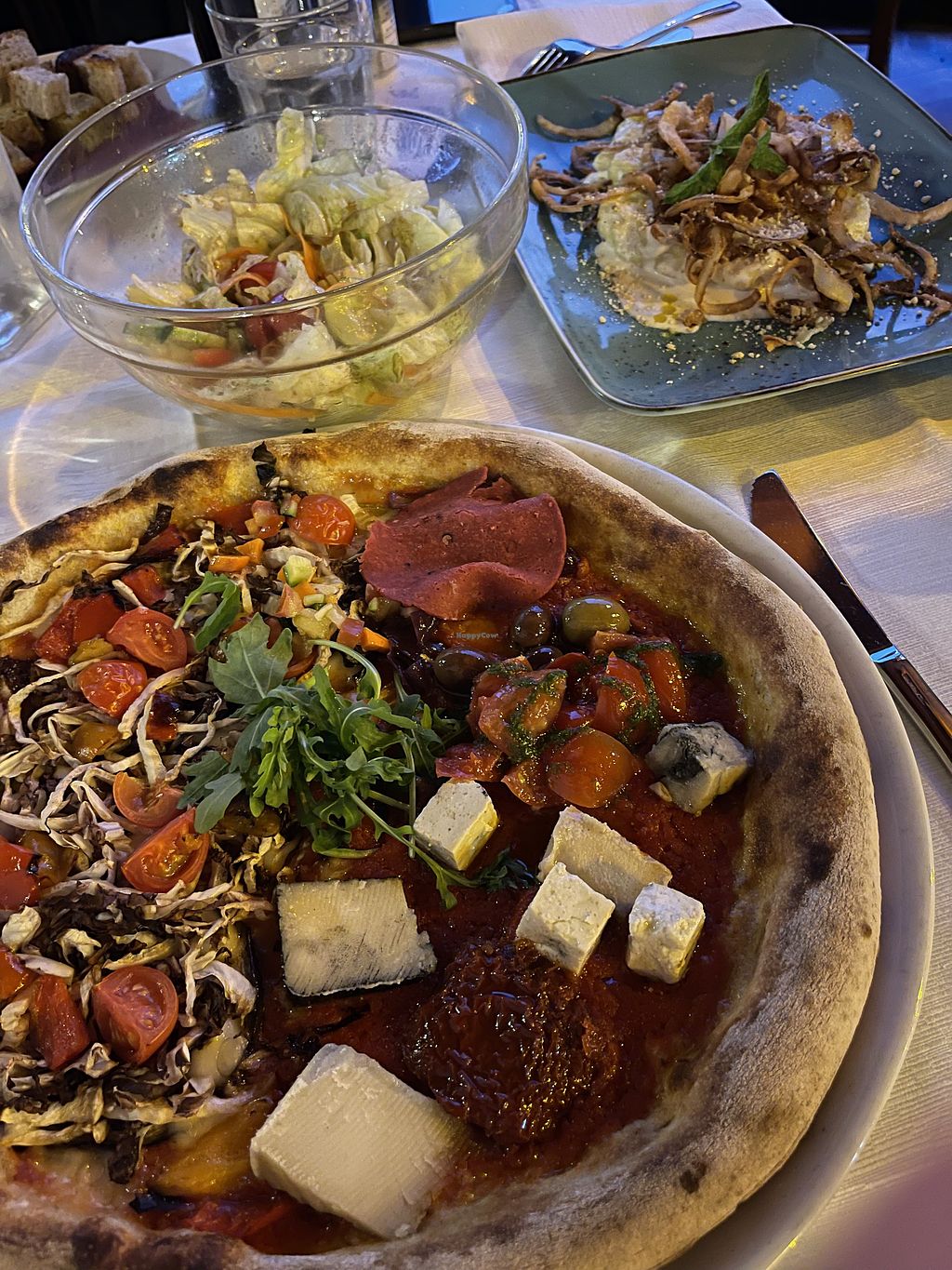Pizza in front, mixed salad and the culurgiones on the rightt