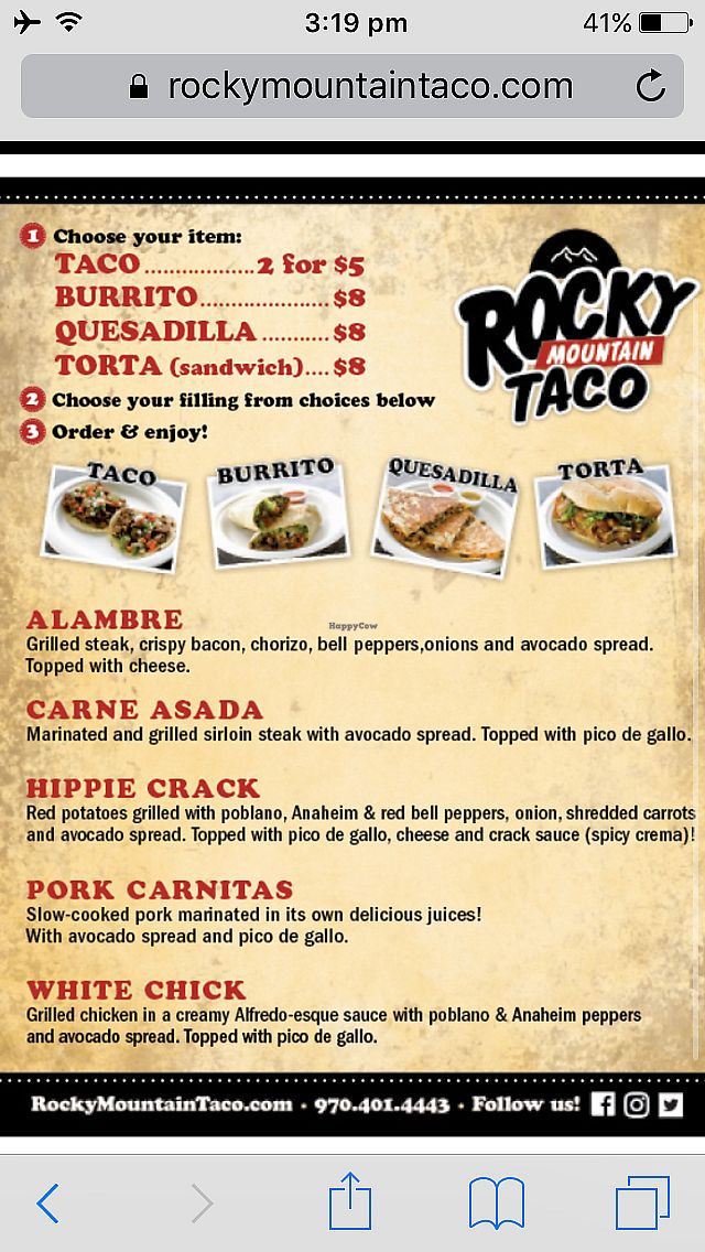 Serves meat, vegan options available. Taco truck parked outside of Vail Brewing Company - check webpage for schedule & locations. On the menu the "hippy crack" is vegetarian but can be made vegan. Or ask what else can be adapted.
