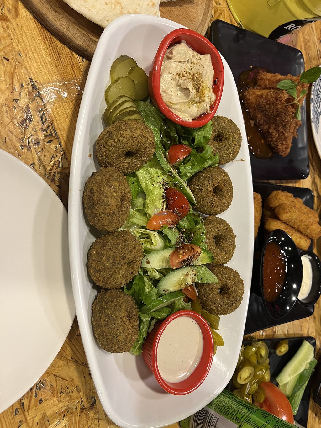 Ordered 2 kinds of Hummus and the falafel plate (non vegan salad also pictured). Came with free bread and 2 plates of veggies for dipping.