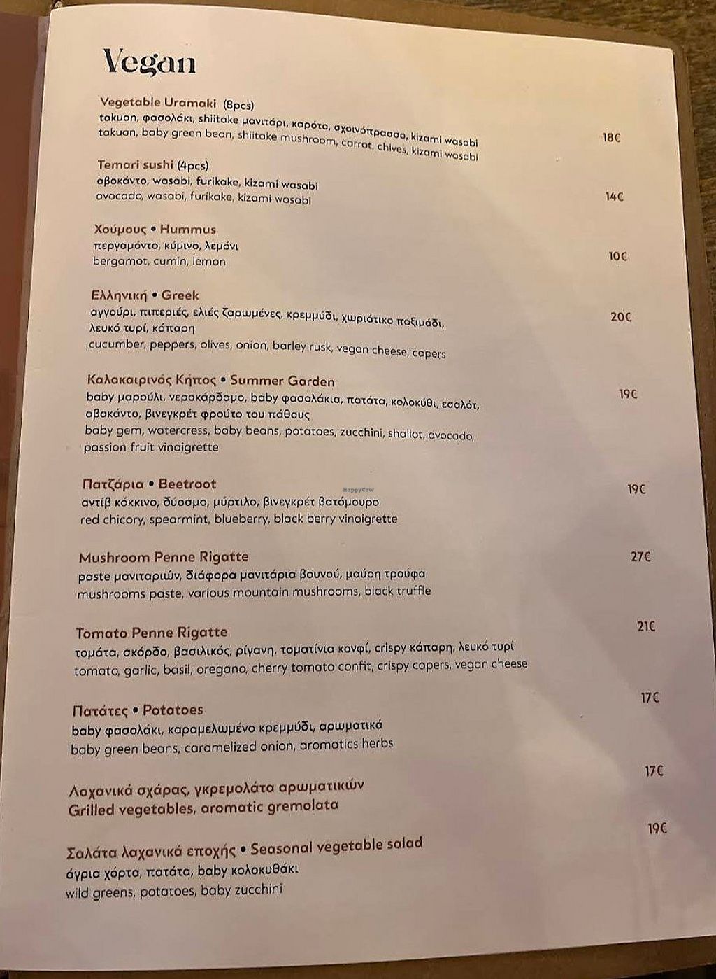 A fully vegan menu with different options (salad, hummus, sushi, pasta etc)