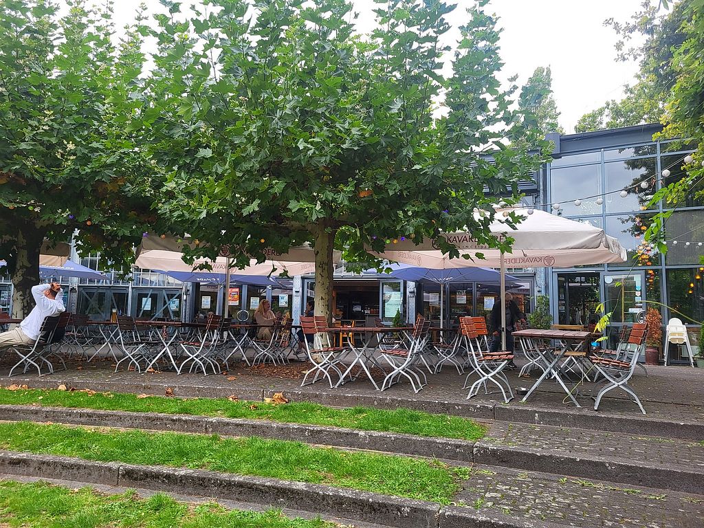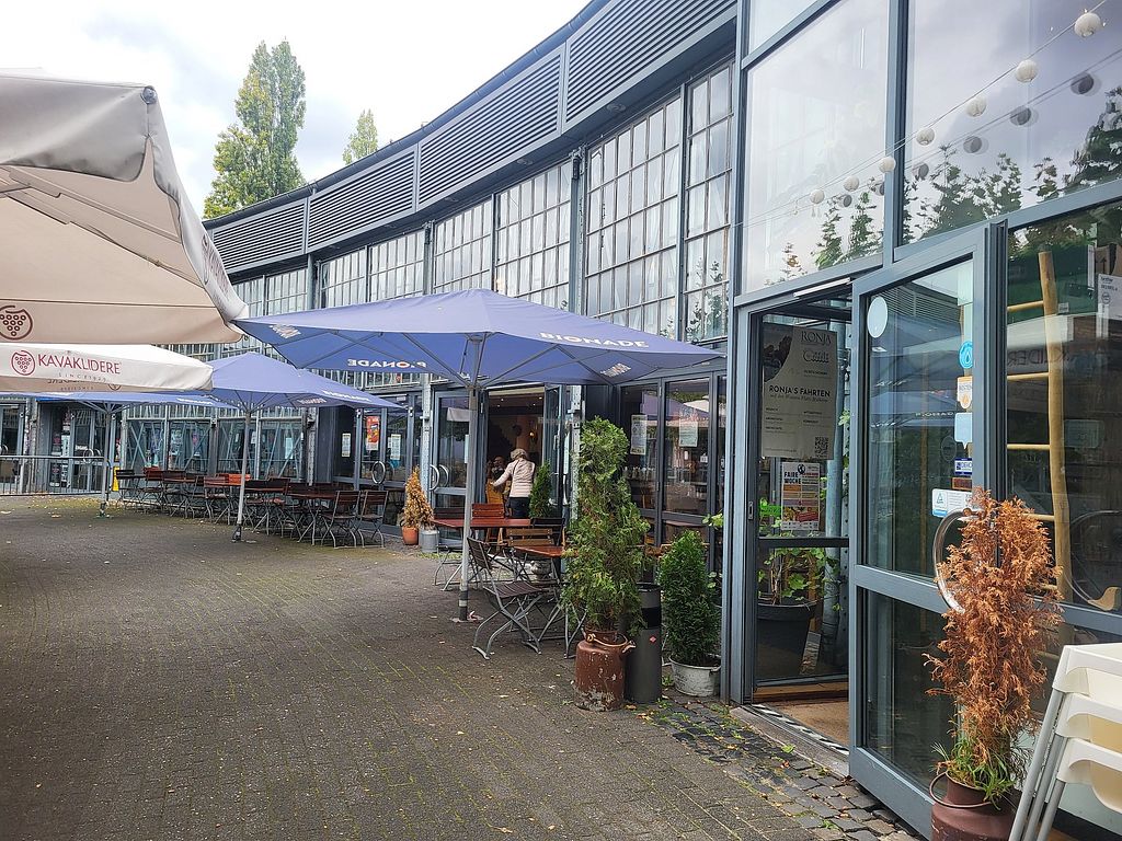 located inside the Ringlok-Schuppen culture center inside a park, with lots of space and seating indoors and also outdoor seating.