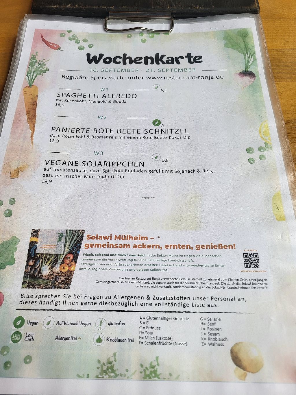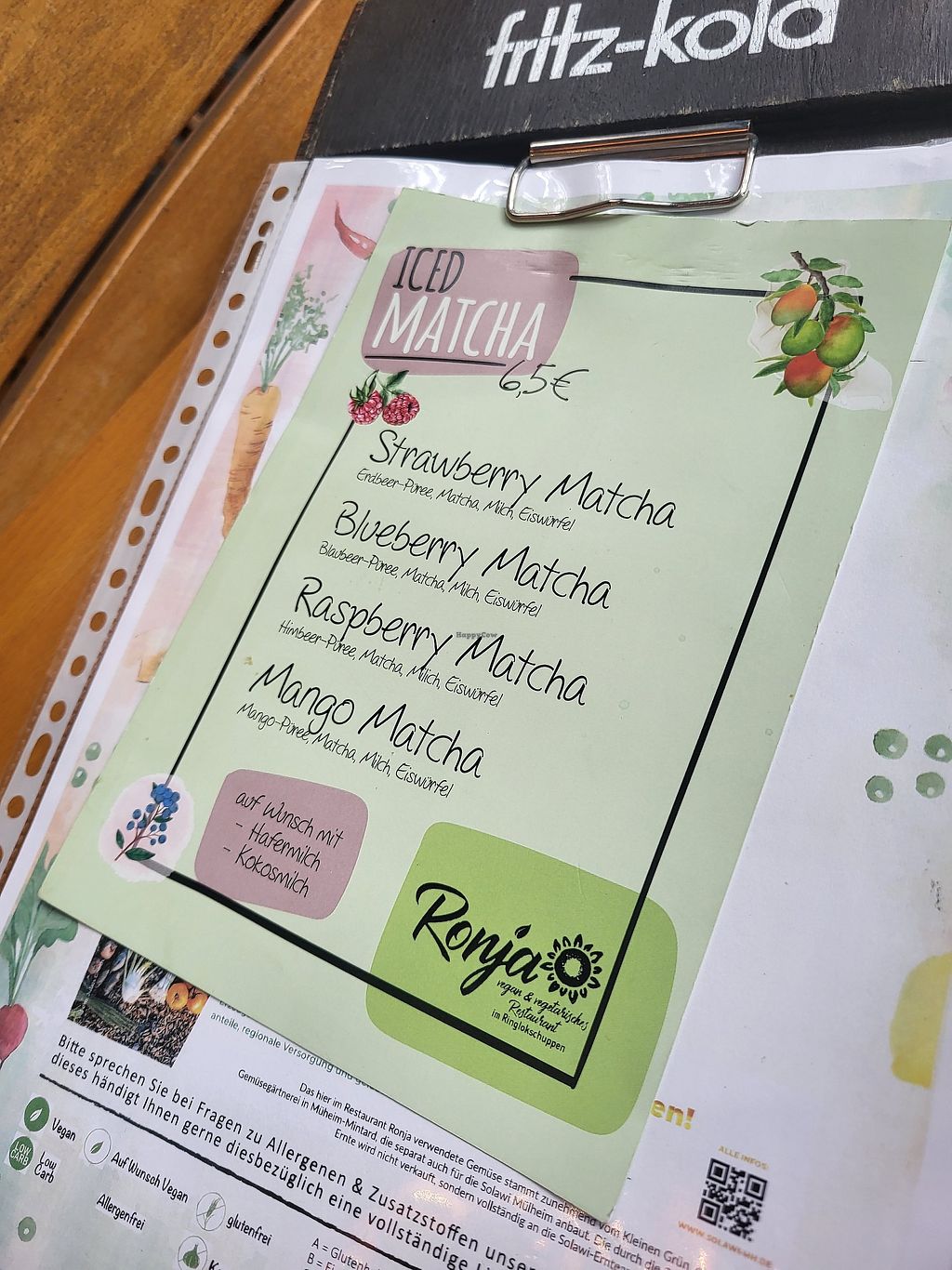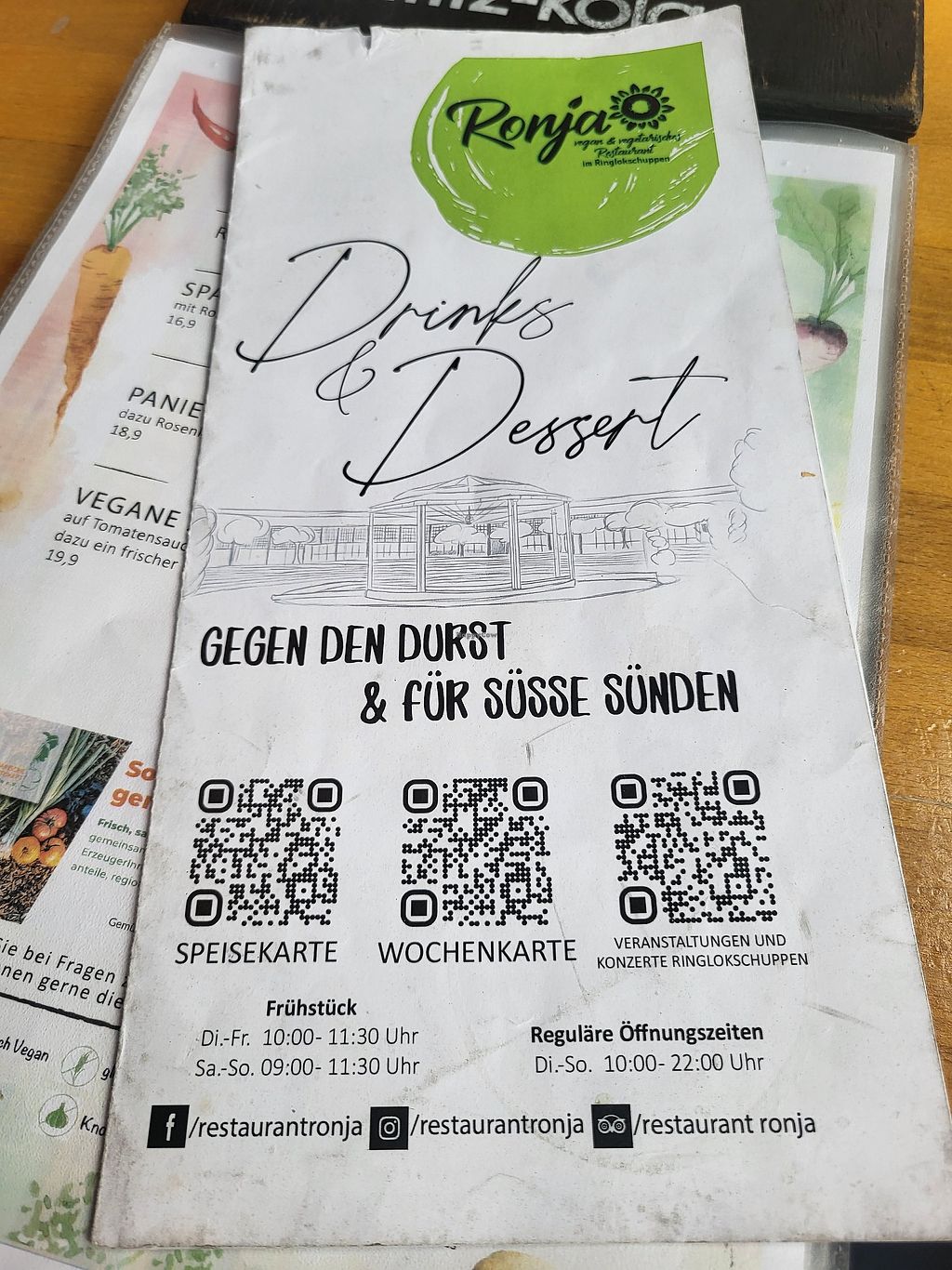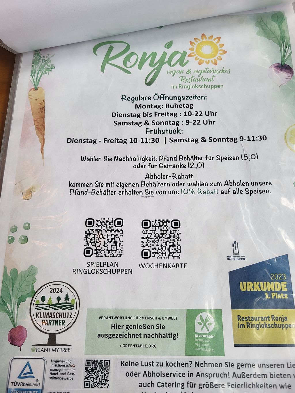 Klar als vegan gekennzeichnetes Gericht bestellt (Penne griechische Art) und die Sahnesauce hat so komisch geschmeckt, dass ich in der Küche hab fragen lassen. War ne Sahnesauce aus Kuhmilch. Gibt anscheinend jedes vegane Gericht auch vegetarisch...da sind Fehler beim jungen Service-personal vorprogrammiert und man kann hier leider nicht vegan essen und vertrauen dass da alle aufpassen. Schade! Hatte mich sehr aufs Ronja gefreut. War hoffentlich eine unglückliche Ausnahme. Habe ein Ersatzessen und eine Entschuldigung bekommen - mündlich, gab nichts extra außer ein paar Stunden Magenparty wegen der Laktose.