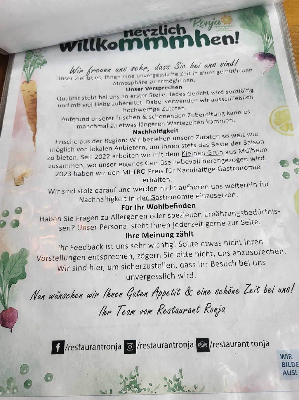 Wenn wir in der Gegend sind halten wir eigentlich immer bei Ronja. Es hat uns immer geschmeckt, die Bedienung ist sehr freundlich und die Atmosphäre ist sehr angenehm.
