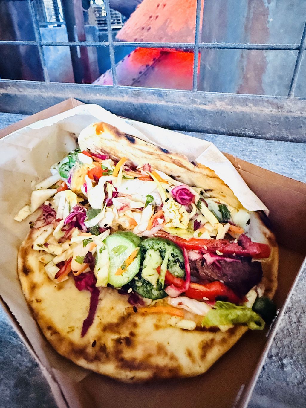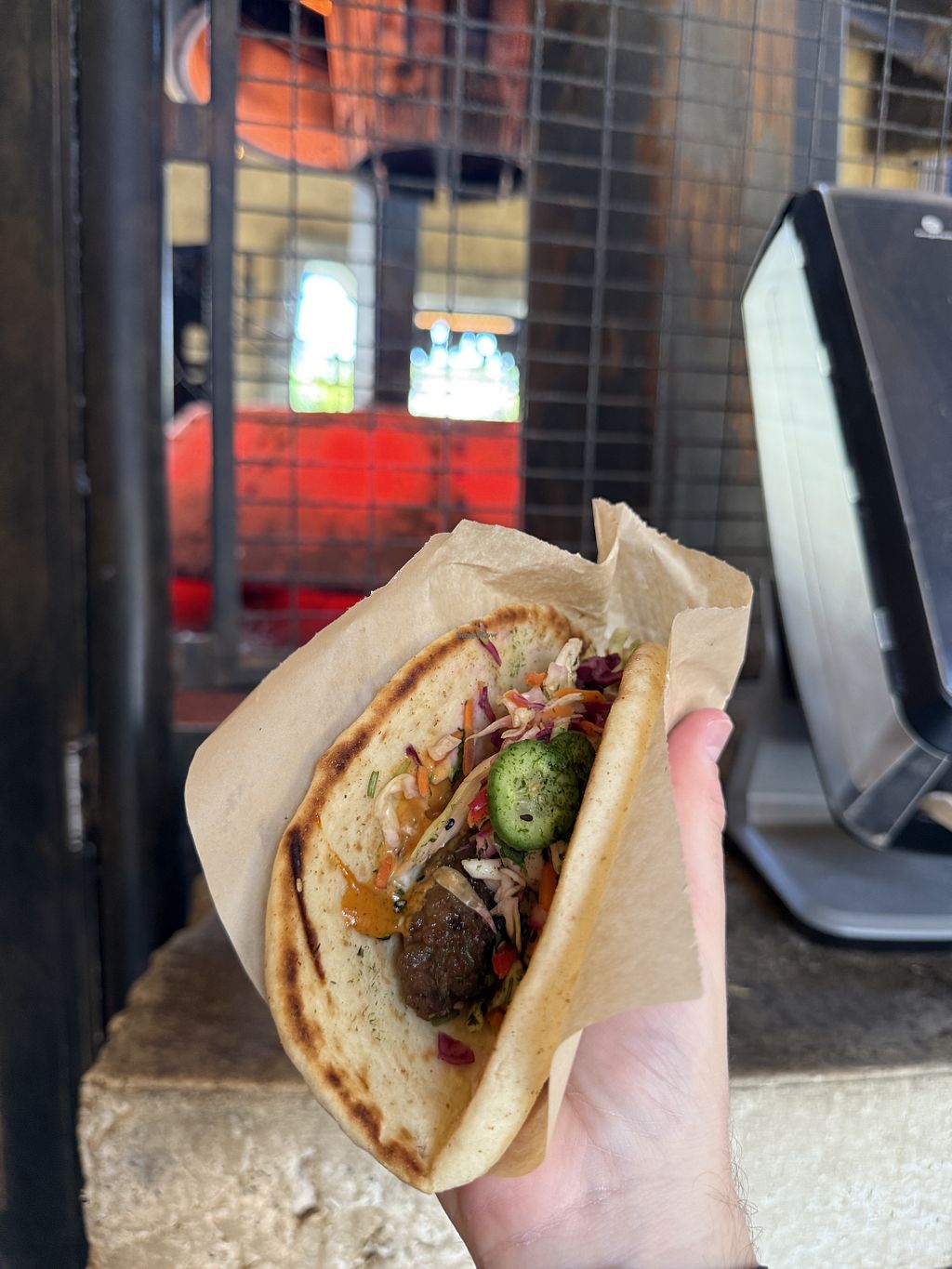 I got the vegan option, which was made with pita bread and vegan sausage with pickled carrots and cucumber. It was super delicious. Also reasonably priced. For the price and the atmosphere I would say it was one of the best things I had on my trip!