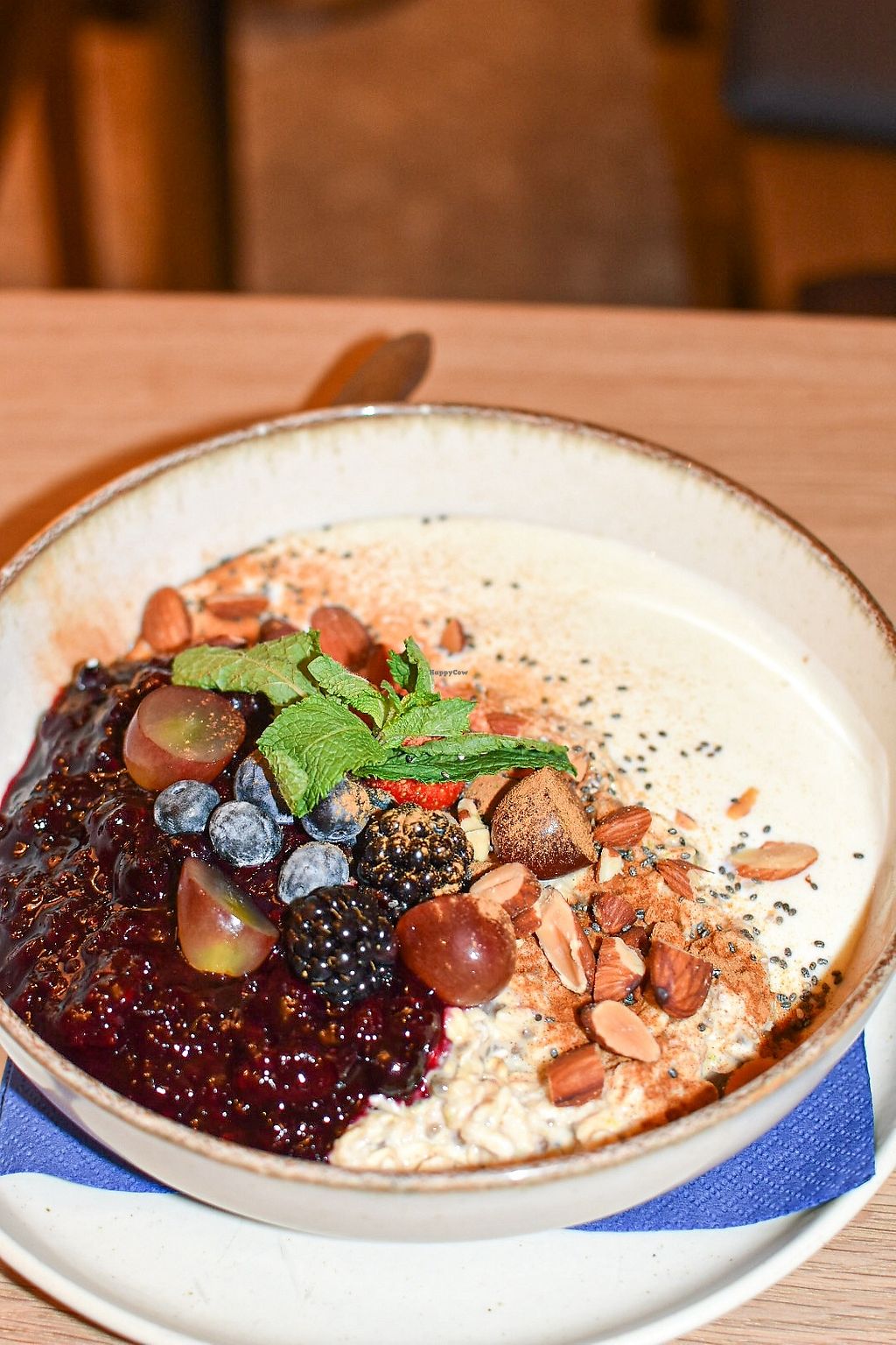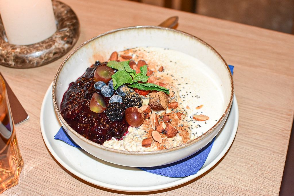 Two options for vegans, almond açai bowl or tropical chia pudding. The açai bowl felt pretty healthy and has granola, almond butter , cacao nibs and plenty of fruit