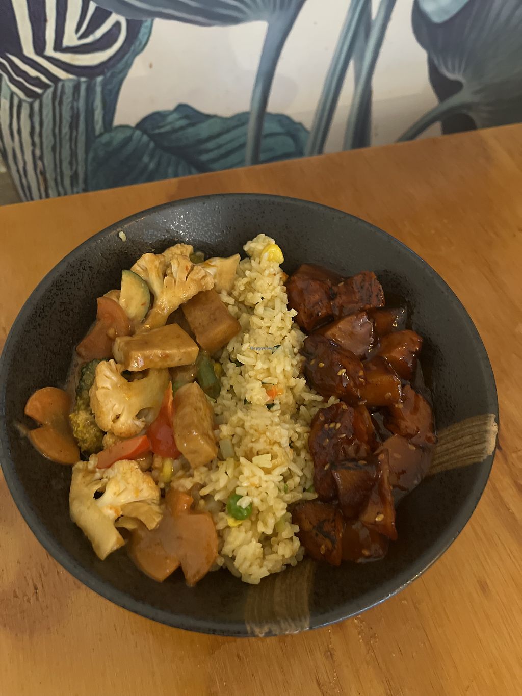Satay tofu, curry rice and bbq pork