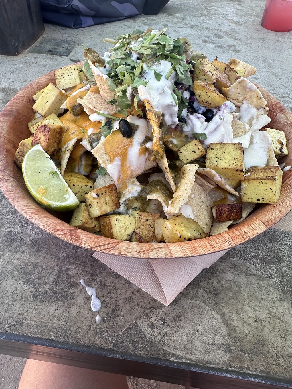 Massive bowl of delicious vegan nachos with cashew queso and a yummy cashew drizzle on top. So big! I added grilled tofu for some protein. Highly recommend!