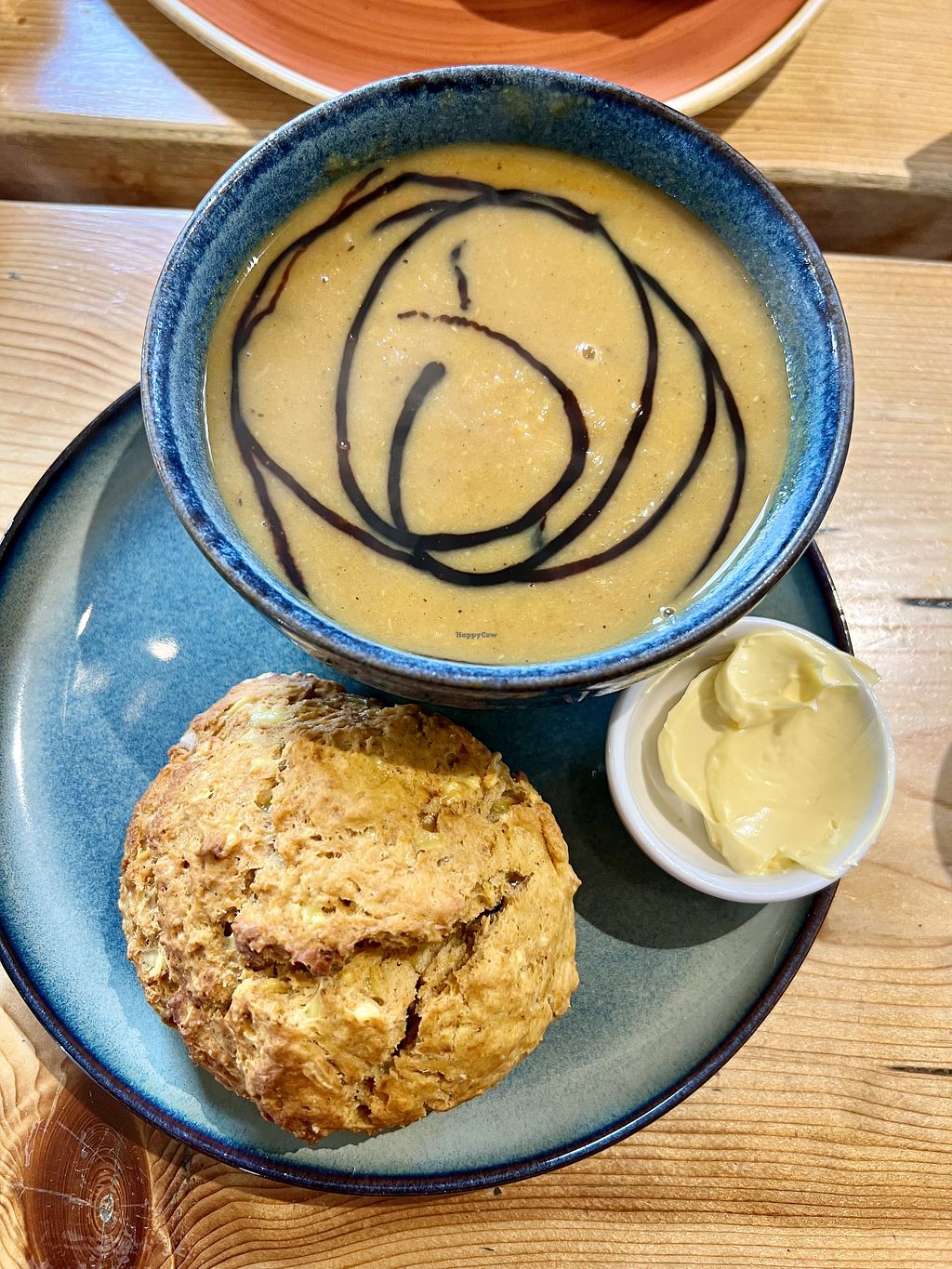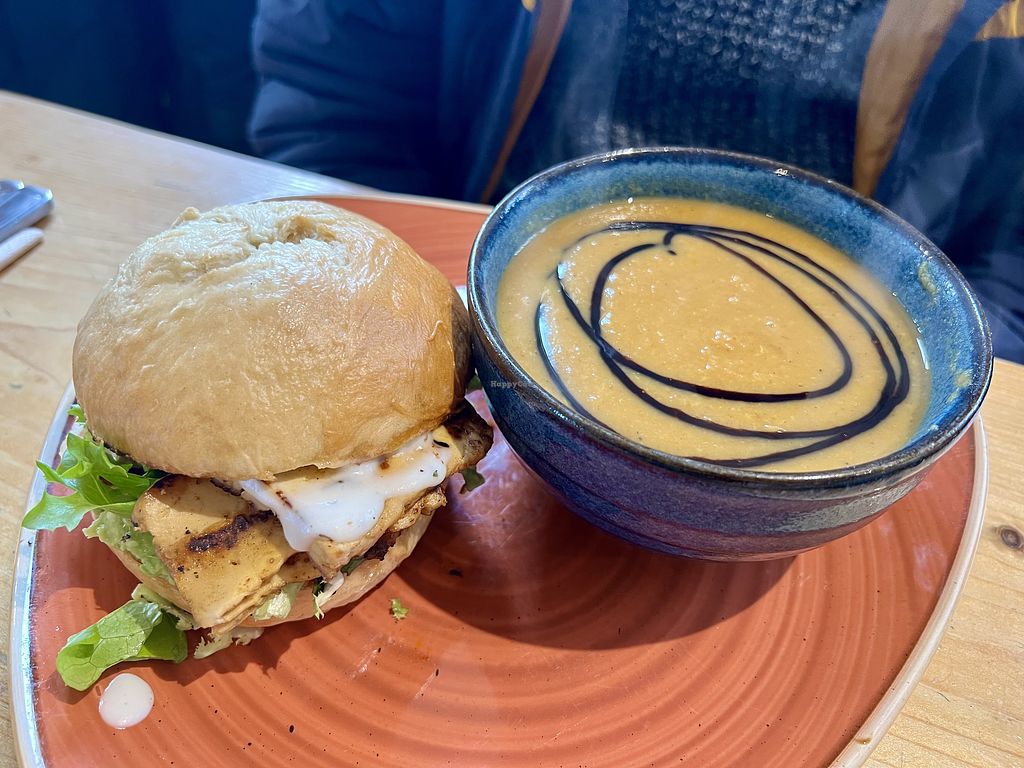 Completely vegetarian/vegan café. Lovely food and friendly staff. The soup of the day (leek and potato) was vegan and came with sourdough and vegan spread. The scone with chocolate chips was also good.