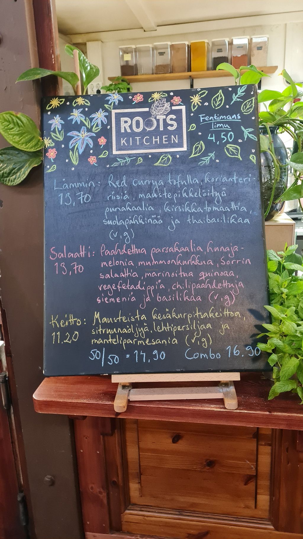 Small menu with three dishes. We had the chickpea curry and the beetroot soup that was gorgeous! Very nice sitting in Turku‘s market hall and enjoying this fresh and delicious meals. It comes with free coffee and tea.