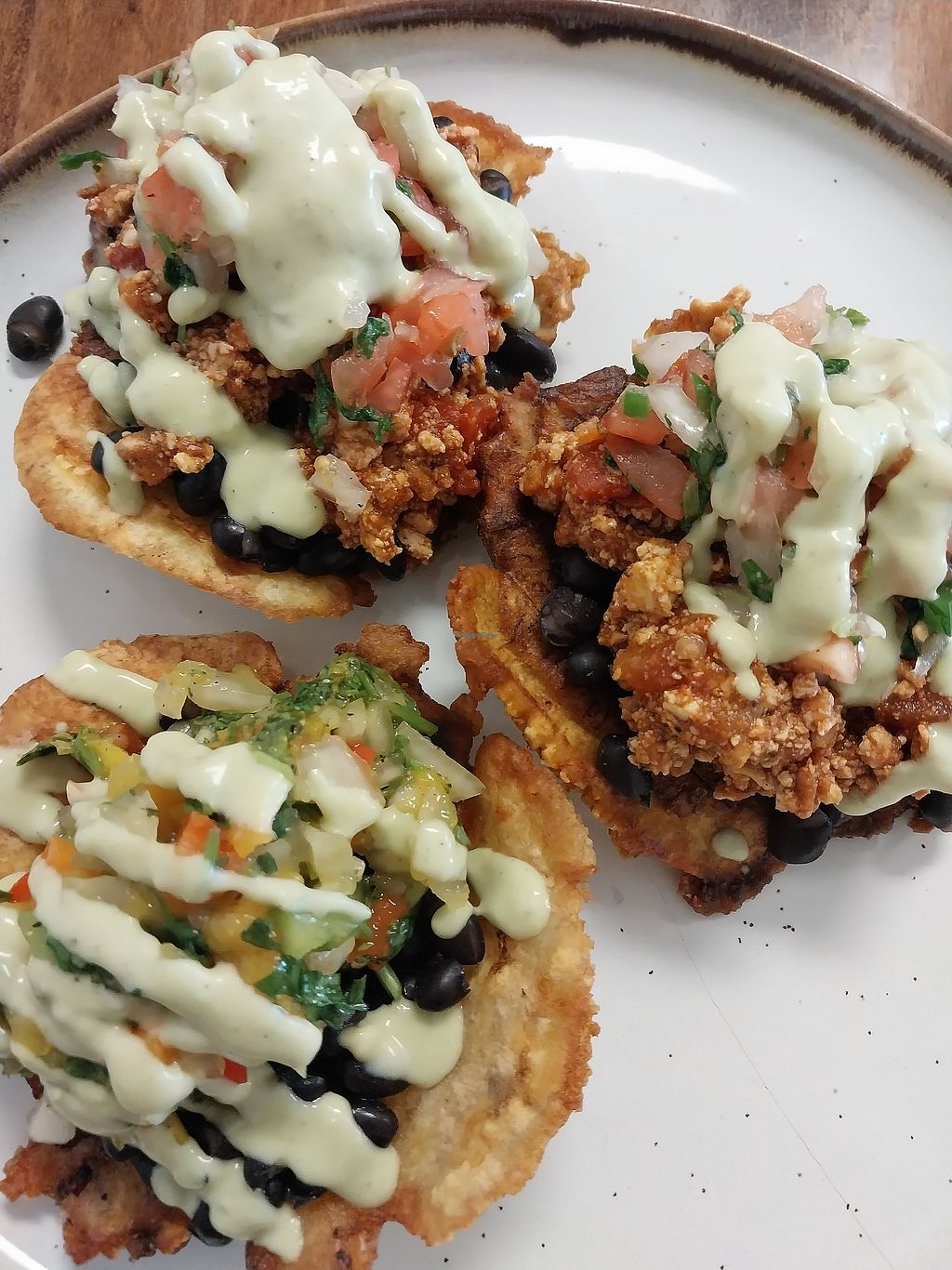 two tofu tostones & a mango salsa tostone (no cojita)
