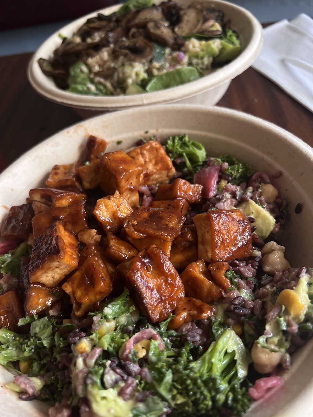 Since you can make your own bowl, the options are unlimited. Their tofu is seasoned to perfection, unlike many other places. Everything is flavorful and they mix it up well so you get a little bit of everything in each bite.