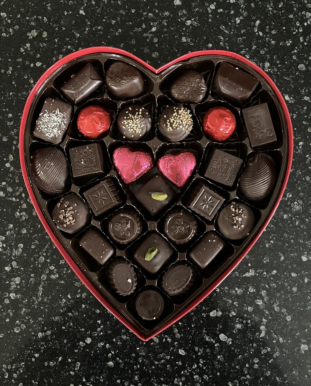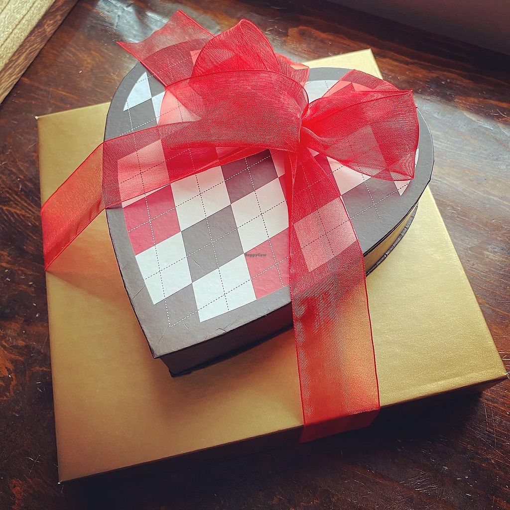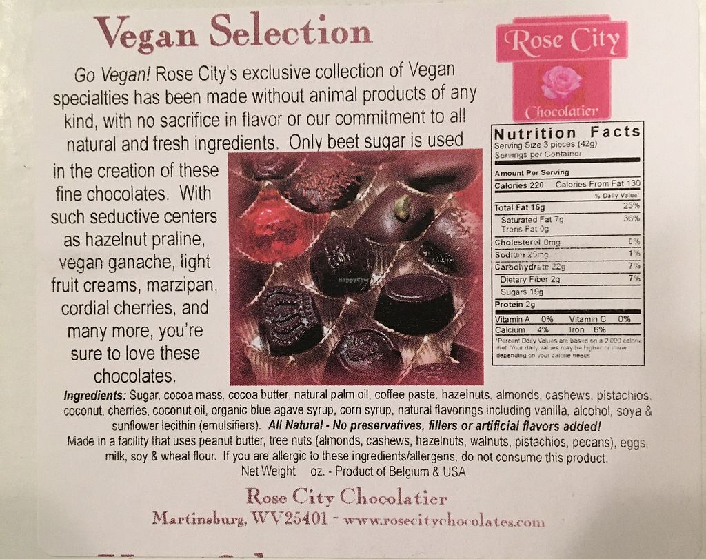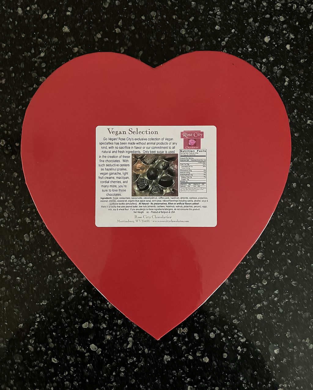 I am an out-of-towner (Minnesota) without a vegan chocolatier anywhere nearby, so I mail ordered the box called “Vegan Valentine’s Selection” (25 pieces) as a shared Valentine’s Day gift for myself and my family.