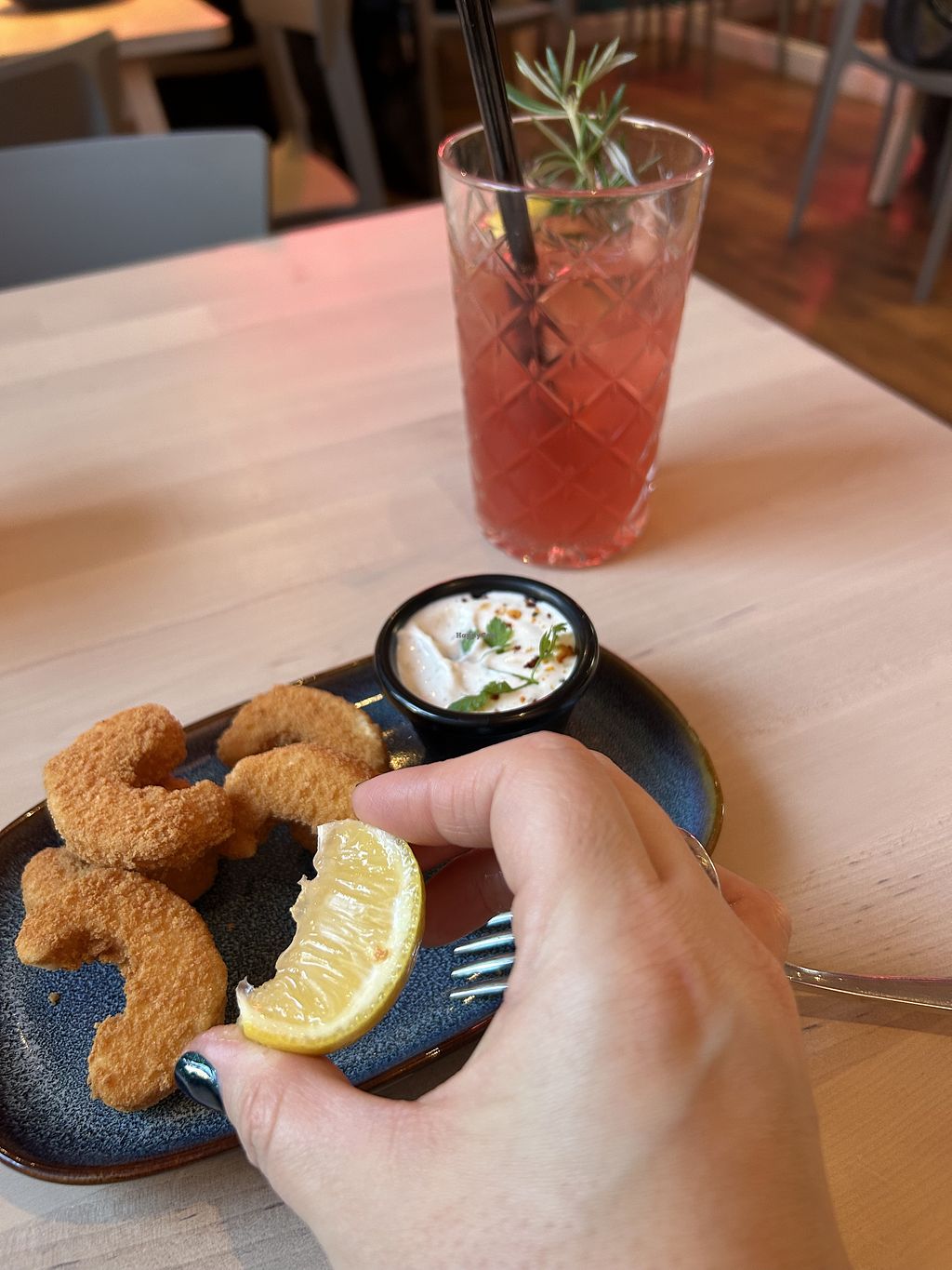 This place is across the street from the main square and Christmas market. I tried the rosemary pink lemonade, shrimp with dipping sauce and the not chicken kebab. All really fresh, tasty and reasonably priced.