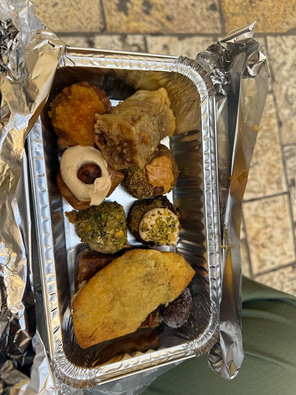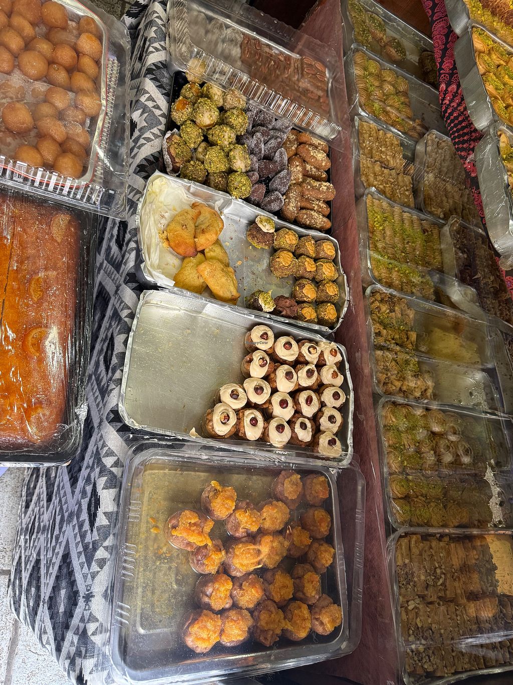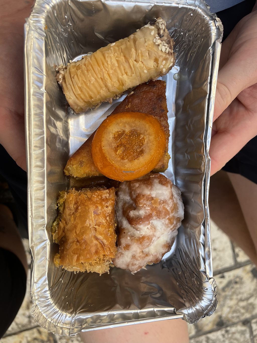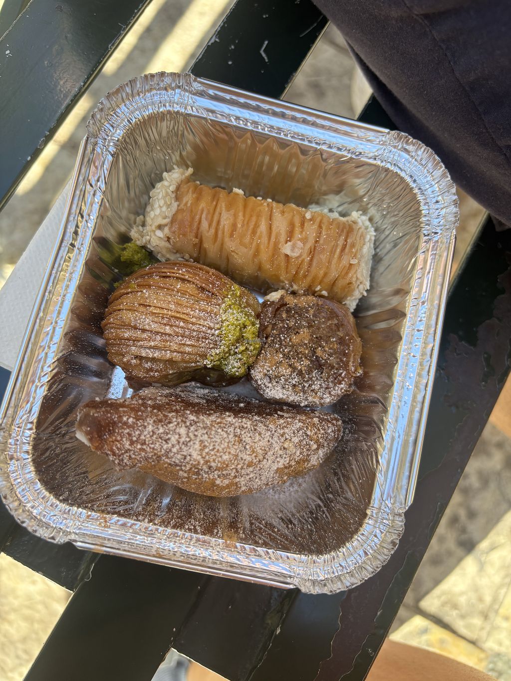 We ordered a variety of things which the owner helped us choose when she asked what our preferences were. She was clear about pricing and options. She has a good understanding of veganism. There was a sesame/hazelnut/chocolate thing that was super yum and also a really great pistachio cream baklava which I devoured. Definitely recommend but it is more expensive than other options in the area.