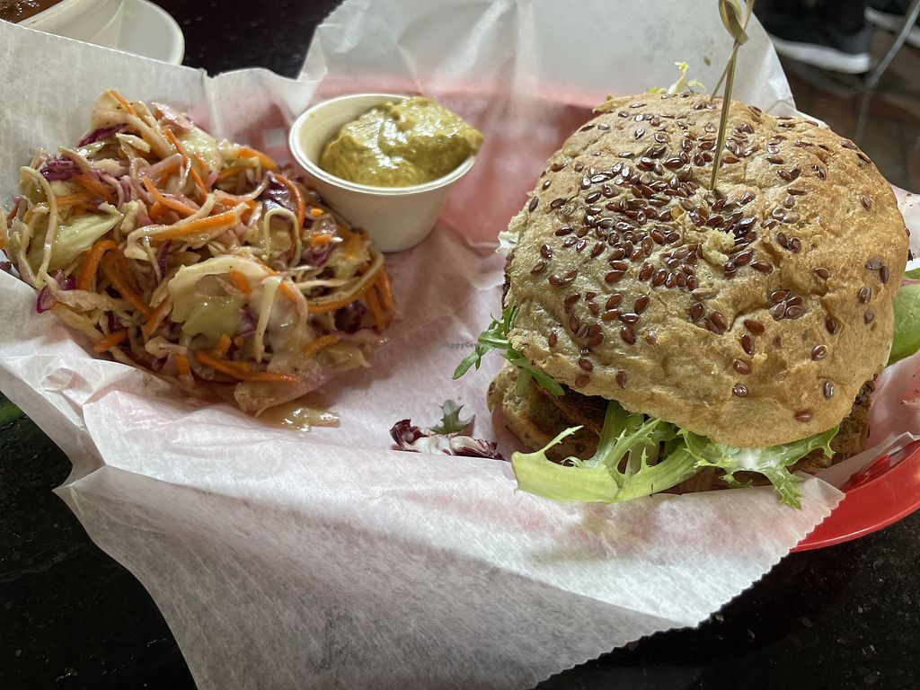 Vegan burger with coleslaw.