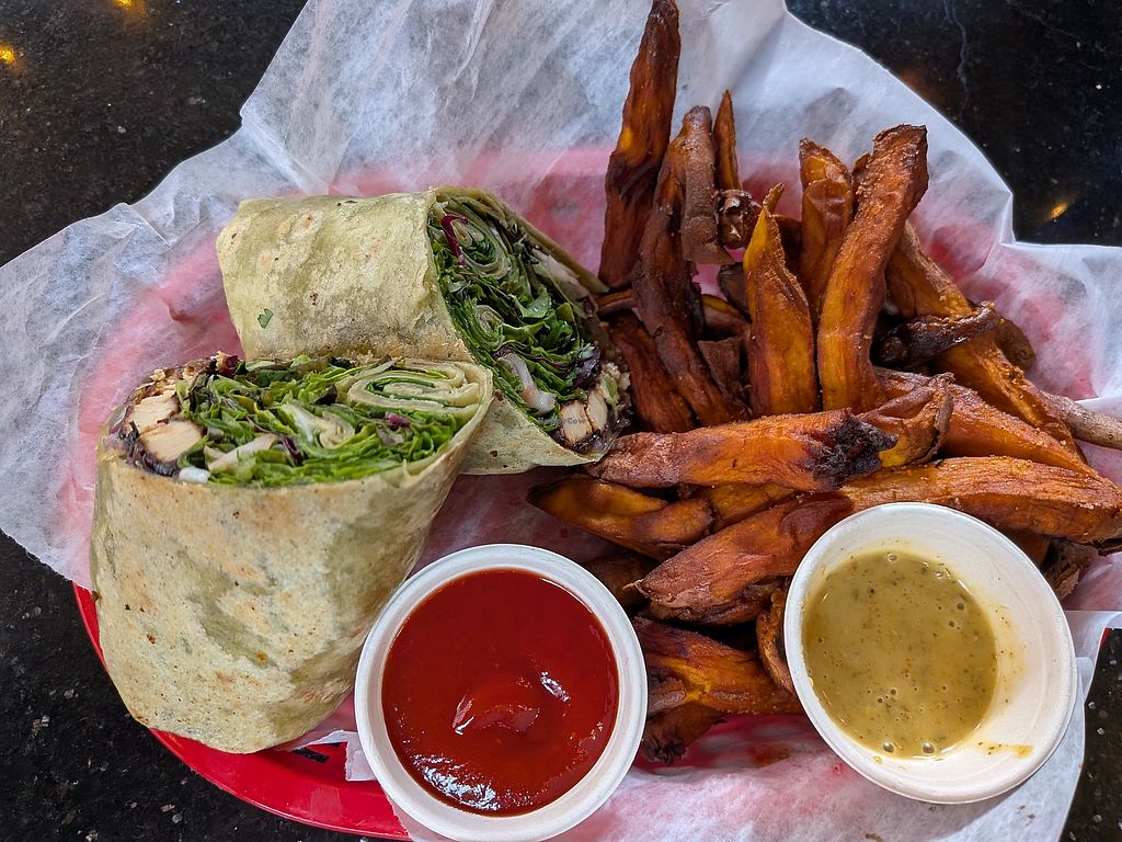Smoky tofu wrap with sweet potato fries