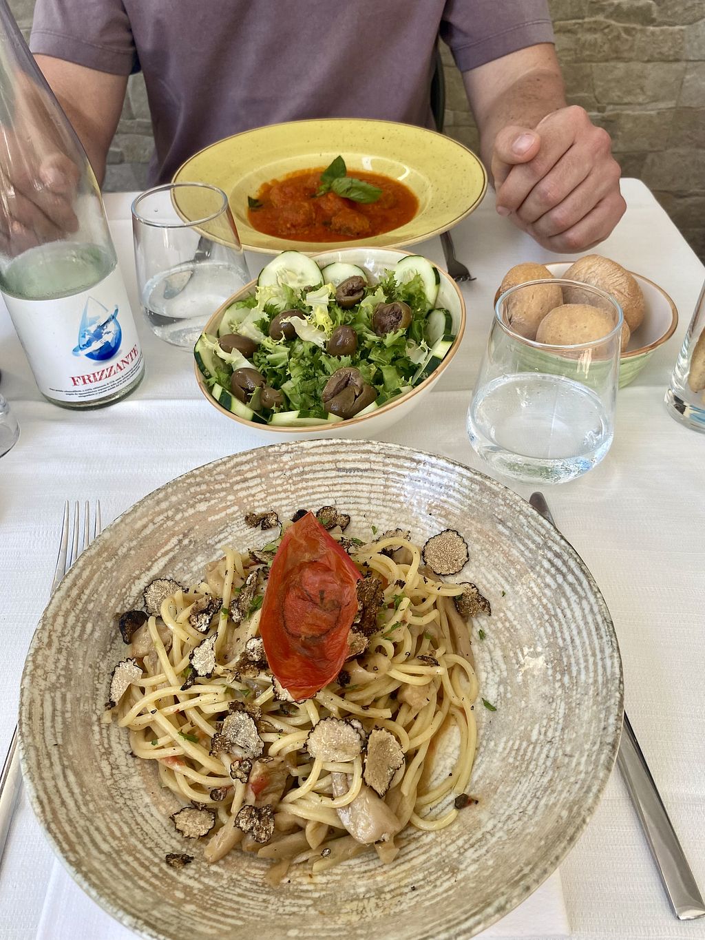Delicious meal. We had the spaghetti with mushrooms and flaked truffle, plus a side of roast potatoes and a salad of fennel, oranges, and capers. Followed that up with a dessert of orange fairy cake, and a lemon sorbet with strawberries.